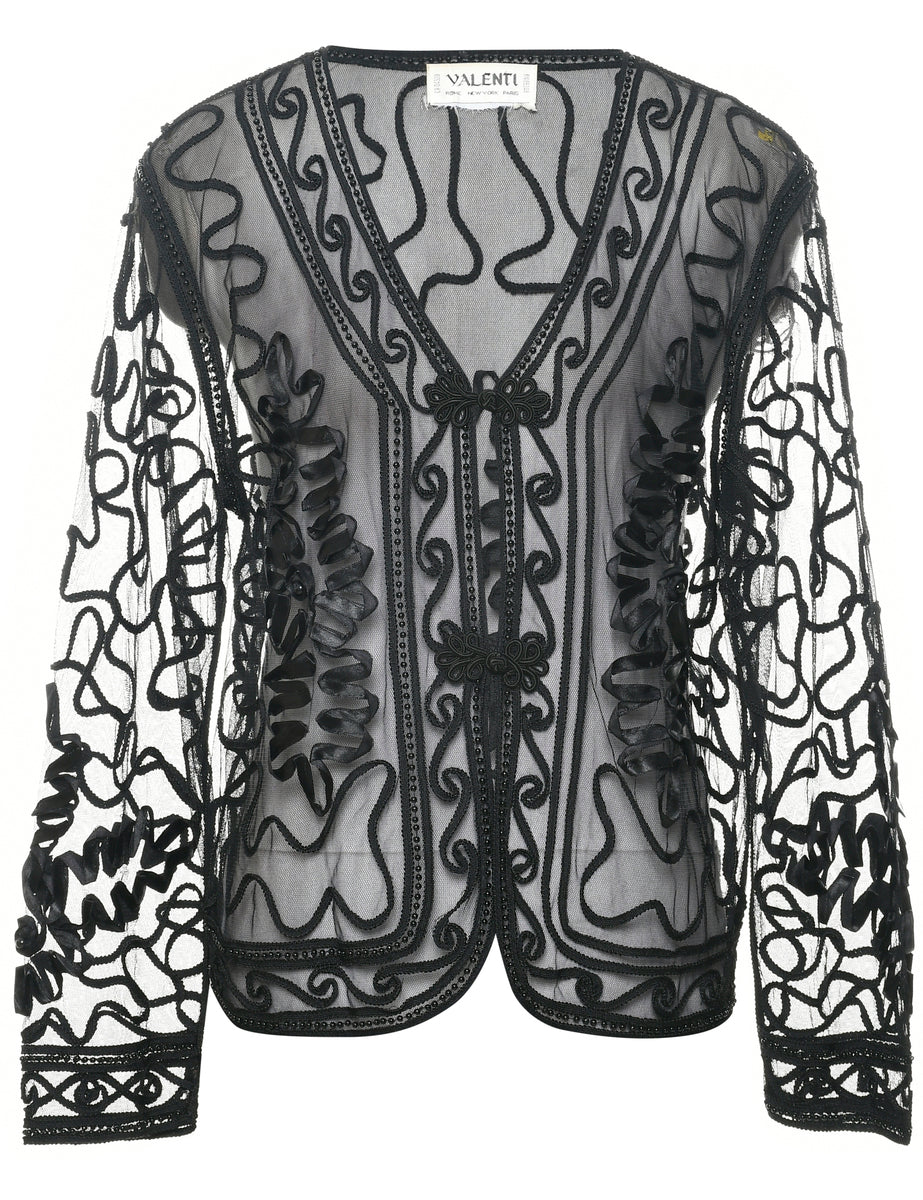 Embroidered evening jacket with sheer effect. Comes in black with beading.
