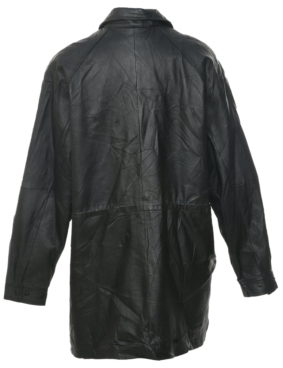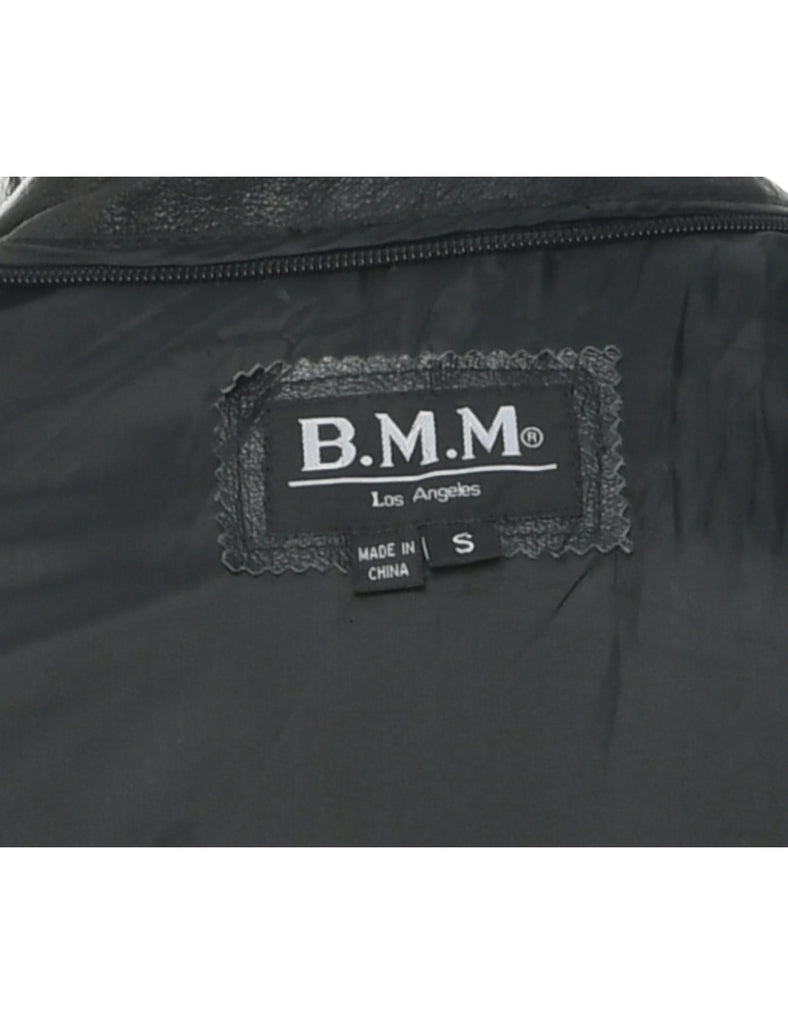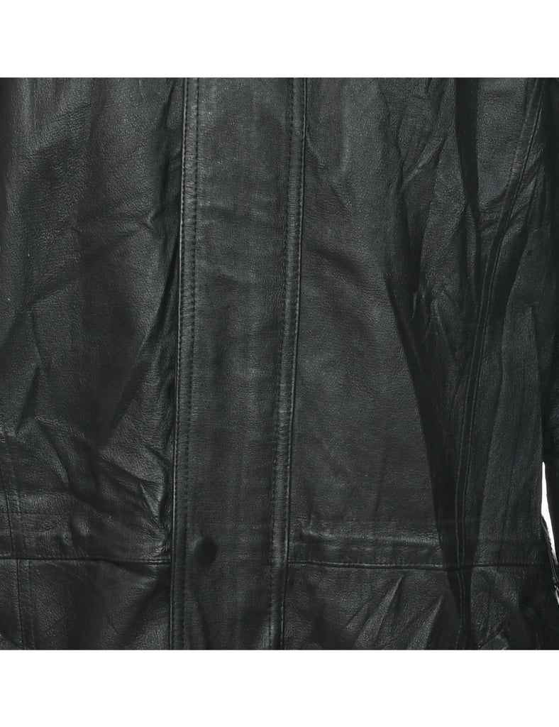 Zip front leather jacket in black with multiple pockets and shoulder pads. The size label mentions S but based on the actual measurements we consider it a size L.