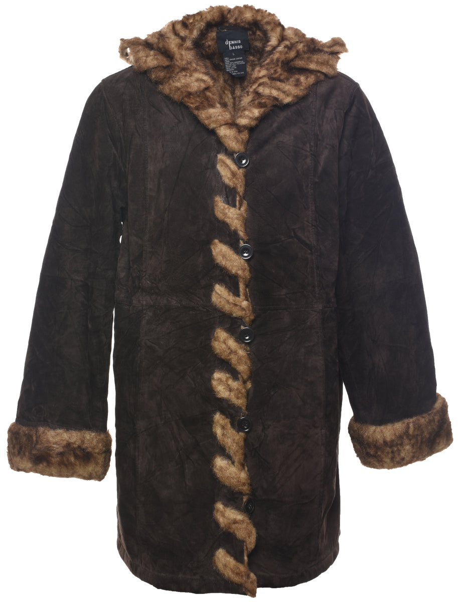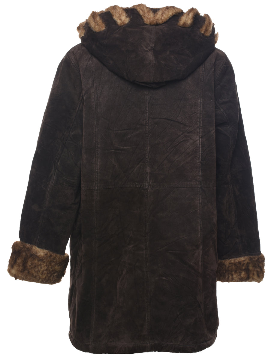Hooded shearling suede jacket in dark brown with multiple pockets.