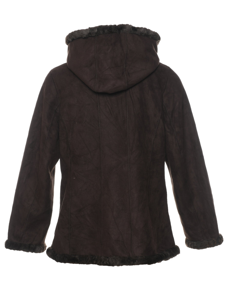 Jones New York hooded jacket comes in dark brown with faux shearling lining and multiple pockets.