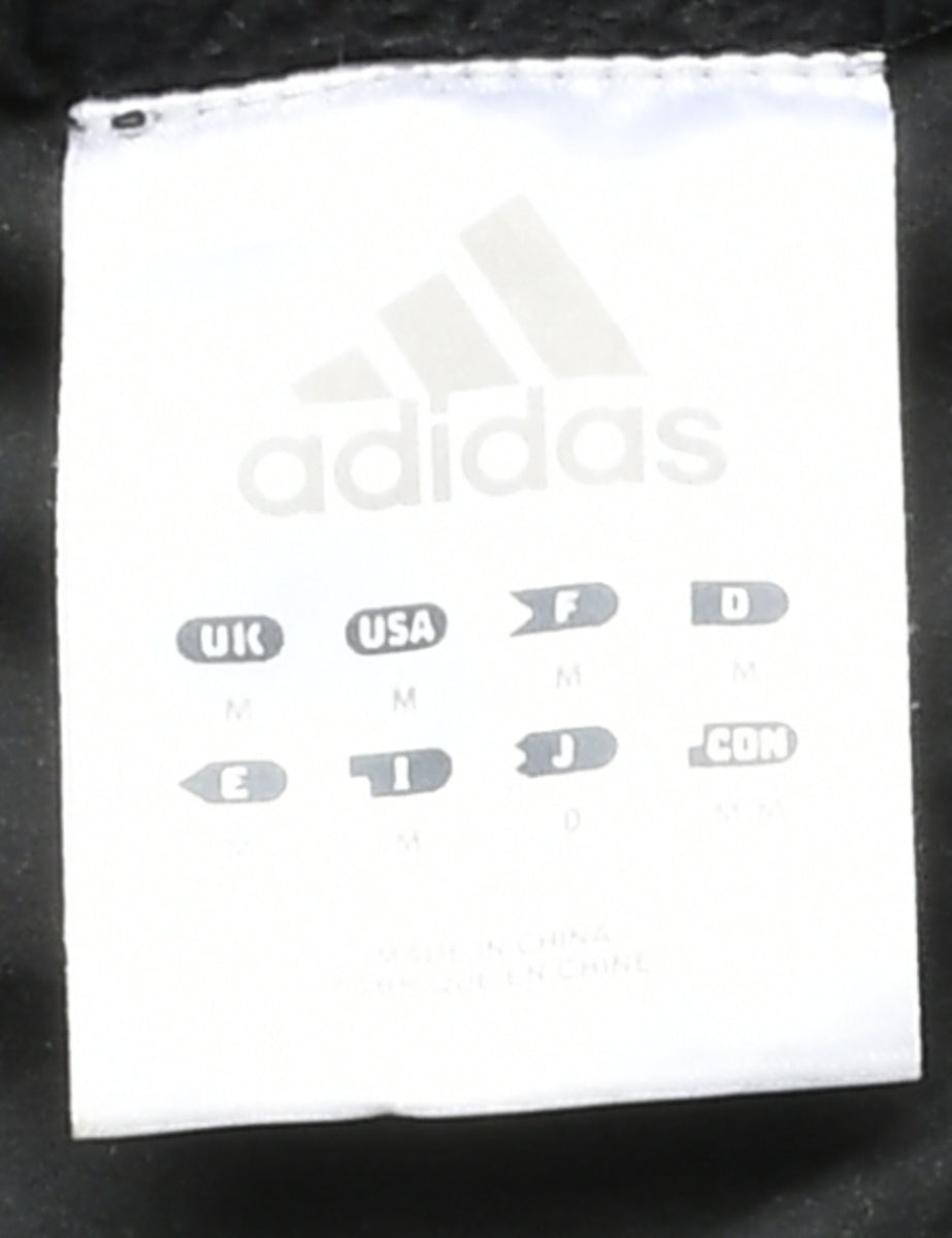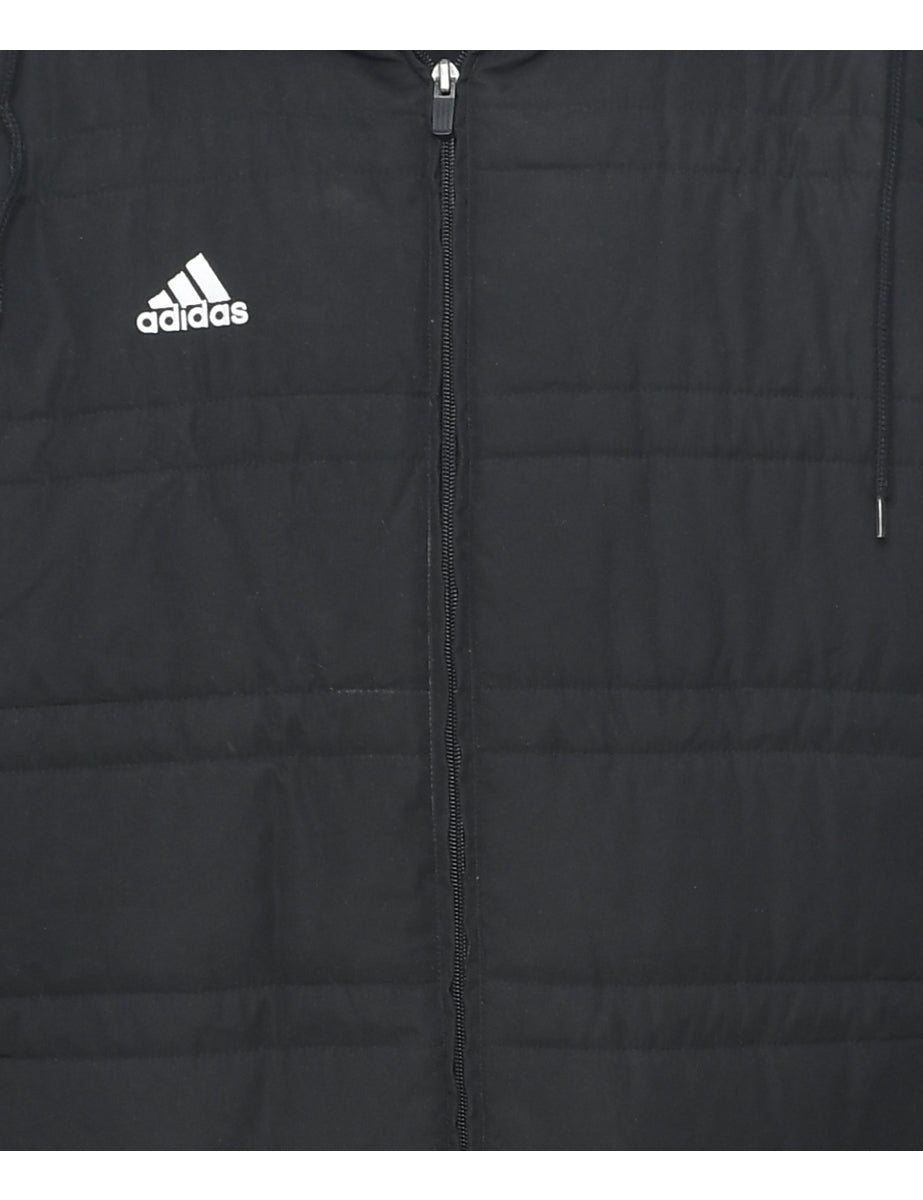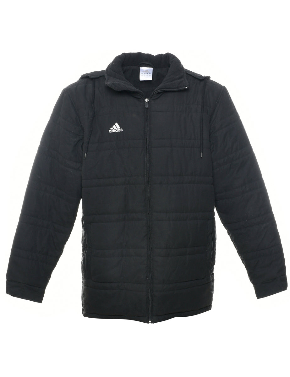 Zip front puffer jacket in black with a hood and multiple pockets.