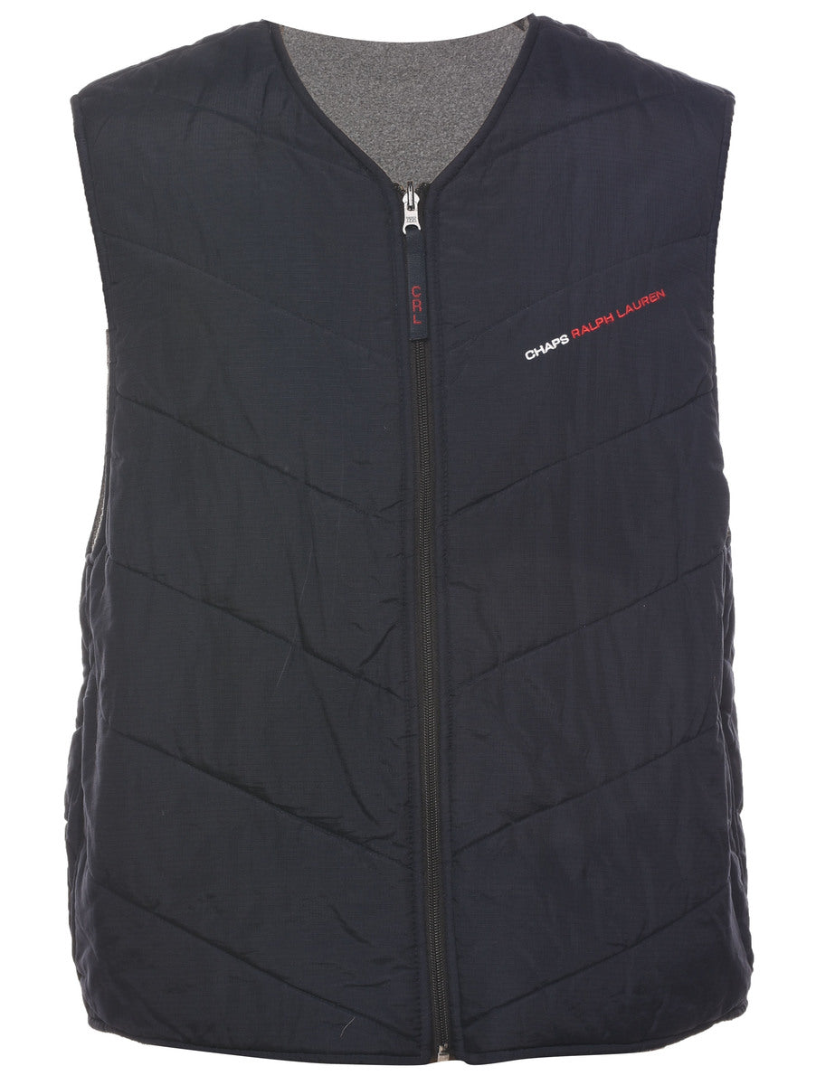 Chaps zip front puffer vest in navy with contrasting lining and multiple pockets.