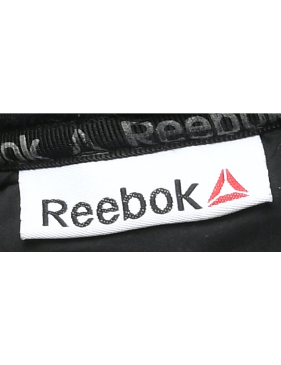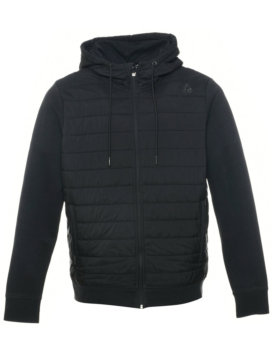 Reebok zip front puffer jacket. Comes in black with a hood and multiple pockets.