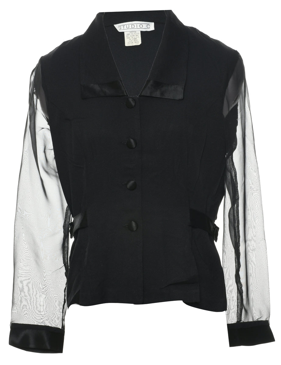 Button front black jacket with sheer sleeves.