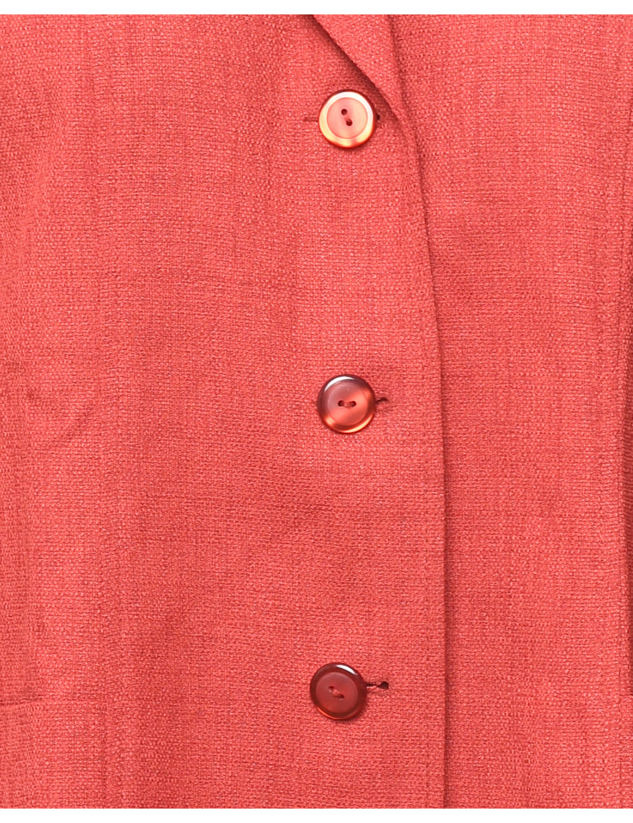Button front red blazer with multiple pockets and built in shoulder pads.