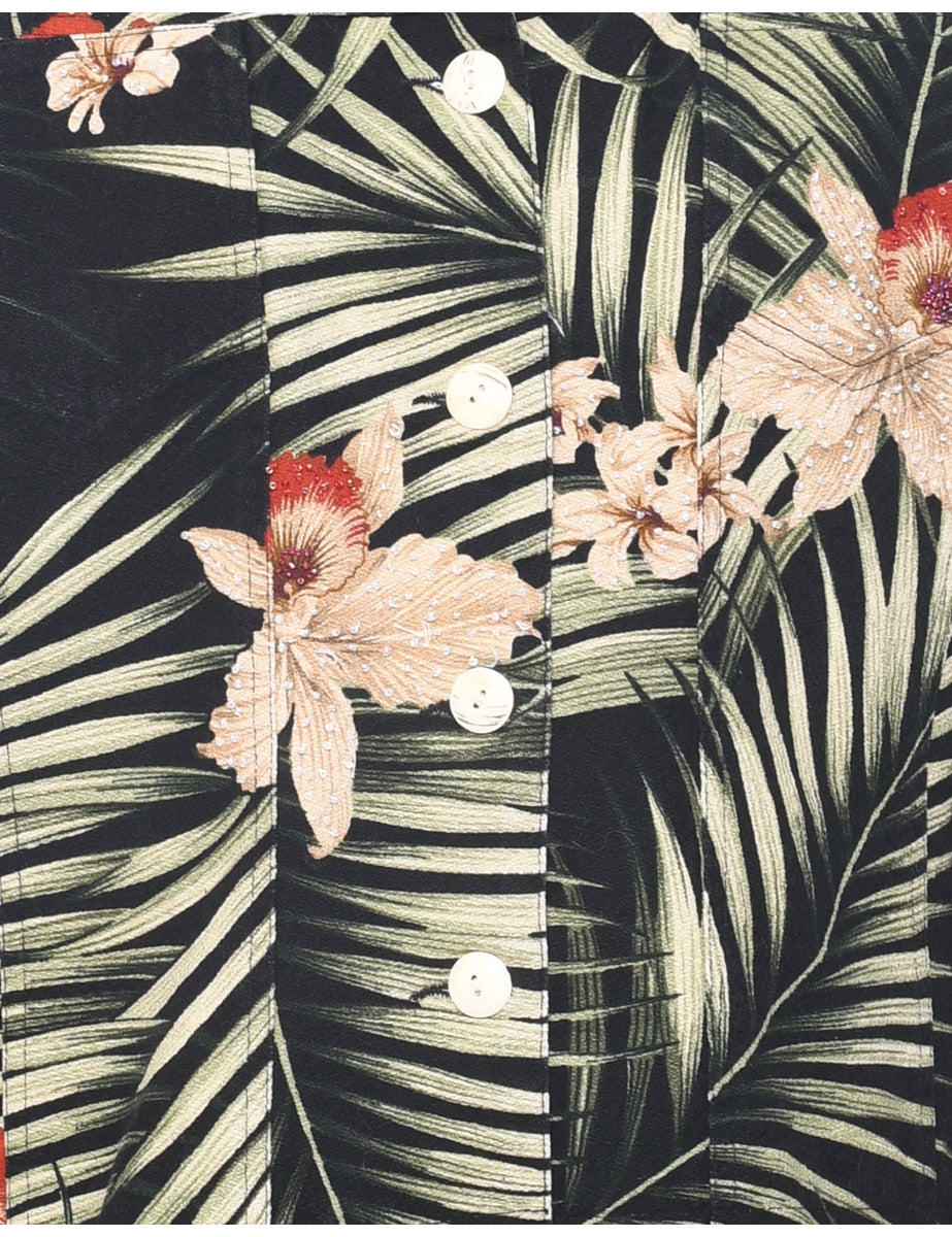Floral pattern black jacket with a classic collar and multiple pockets.