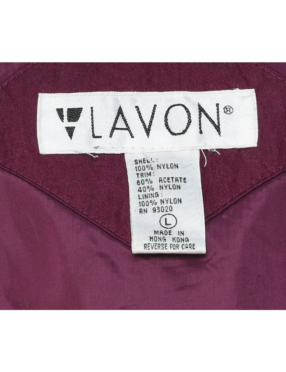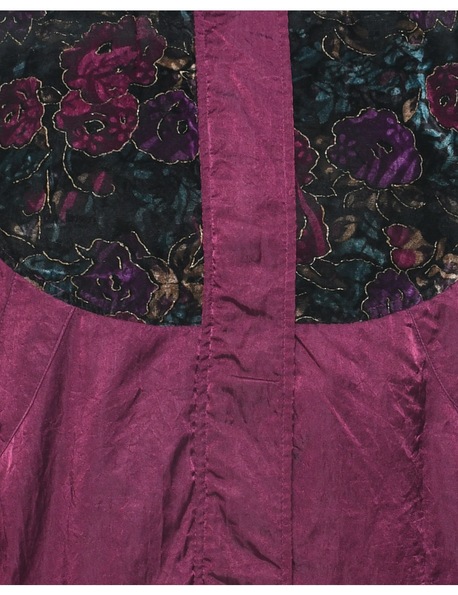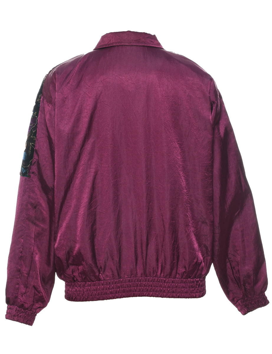 Floral pattern nylon jacket in magenta with multiple pockets and shoulder pads.