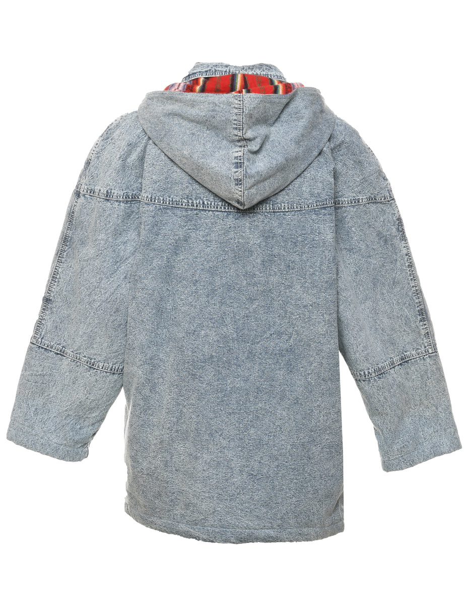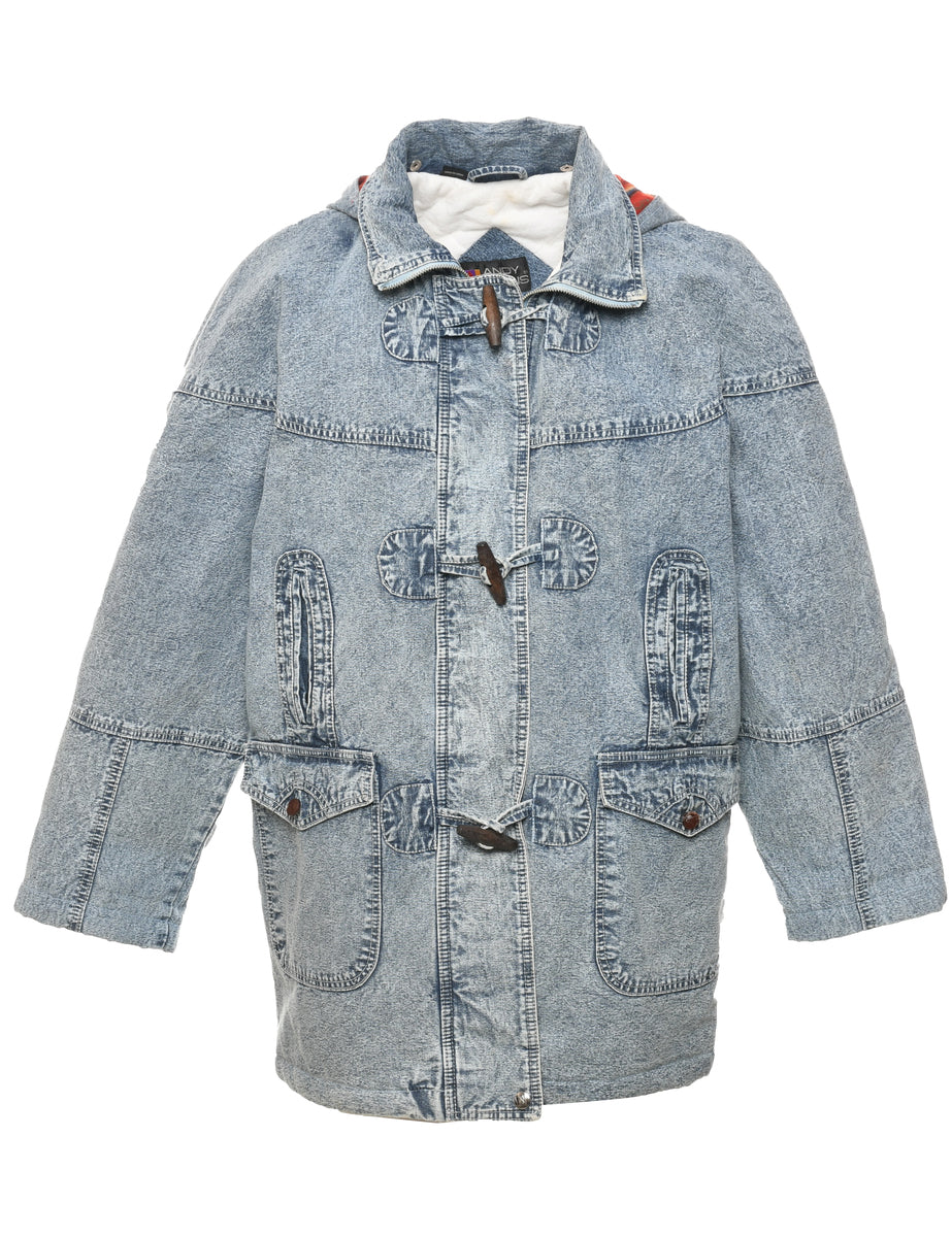 Hooded denim jacket comes in acid wash with multiple pockets.