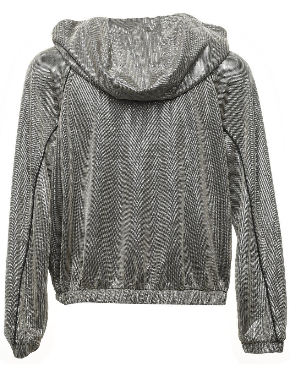 Lurex thread pattern hooded jacket. Comes in silver with multiple pockets.