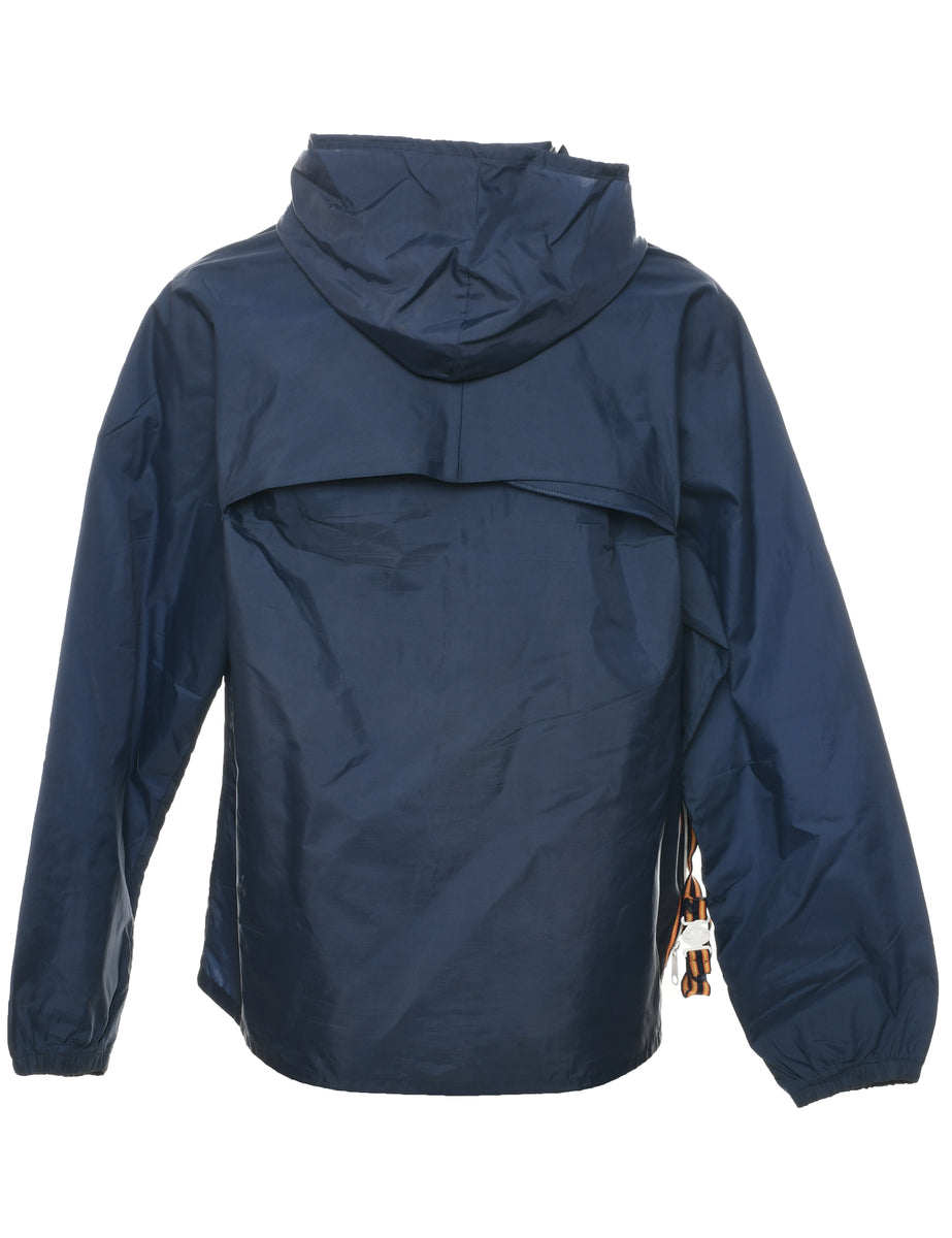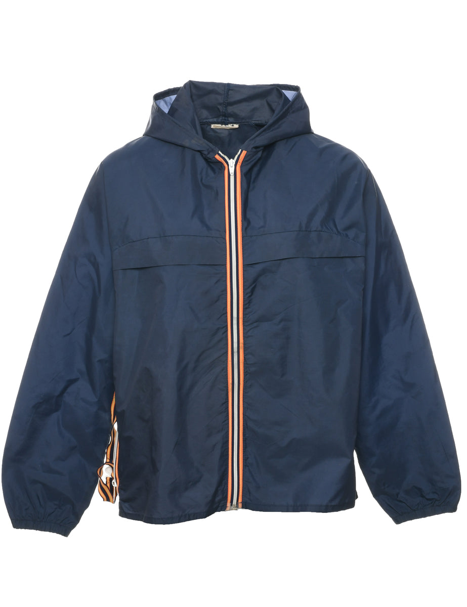 Hooded nylon jacket in navy with multiple pockets and contrasting fabric trim.