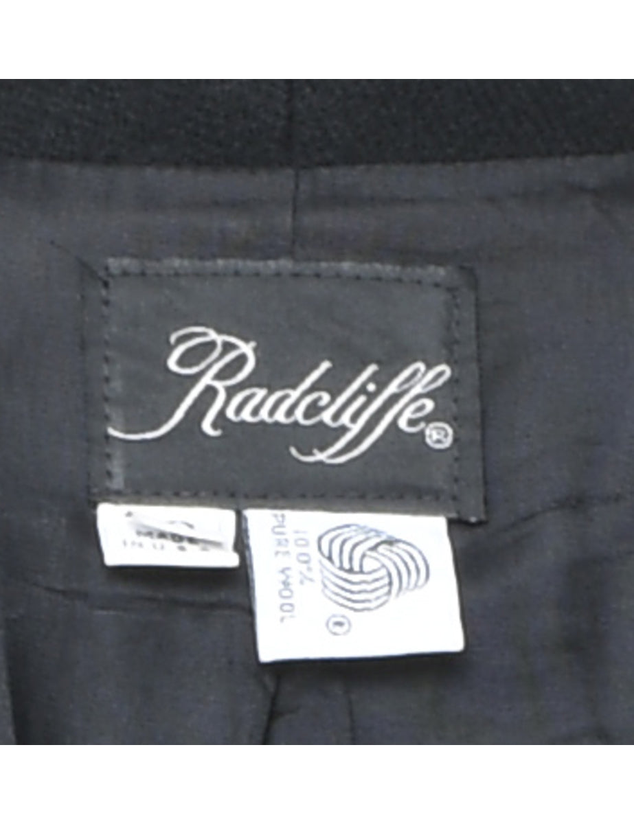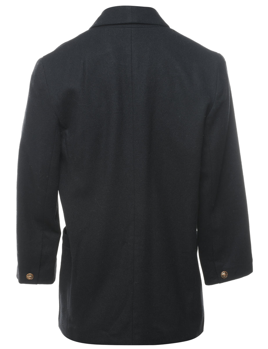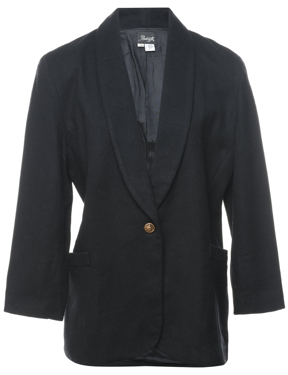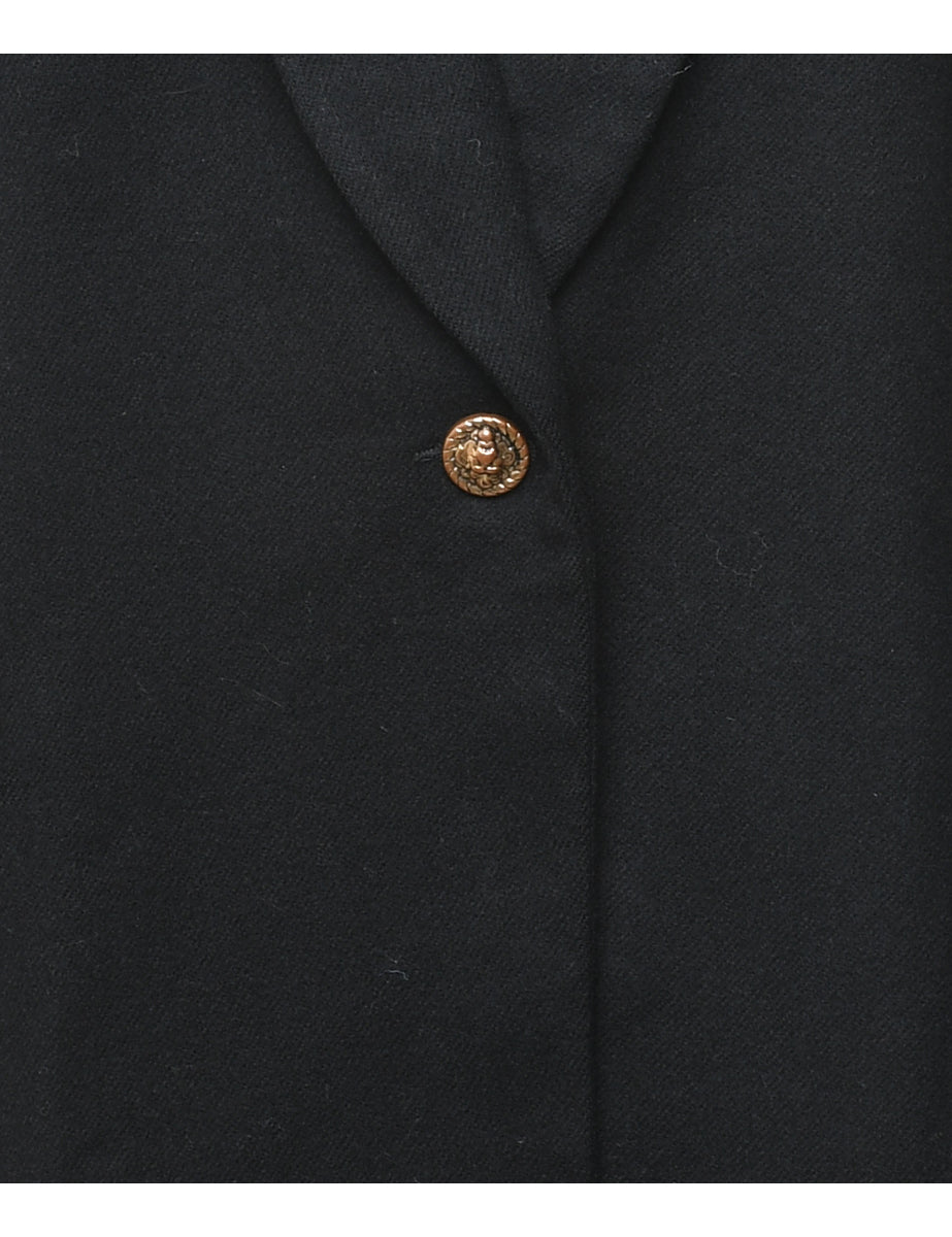 Button front black blazer with multiple pockets and built in shoulder pads.