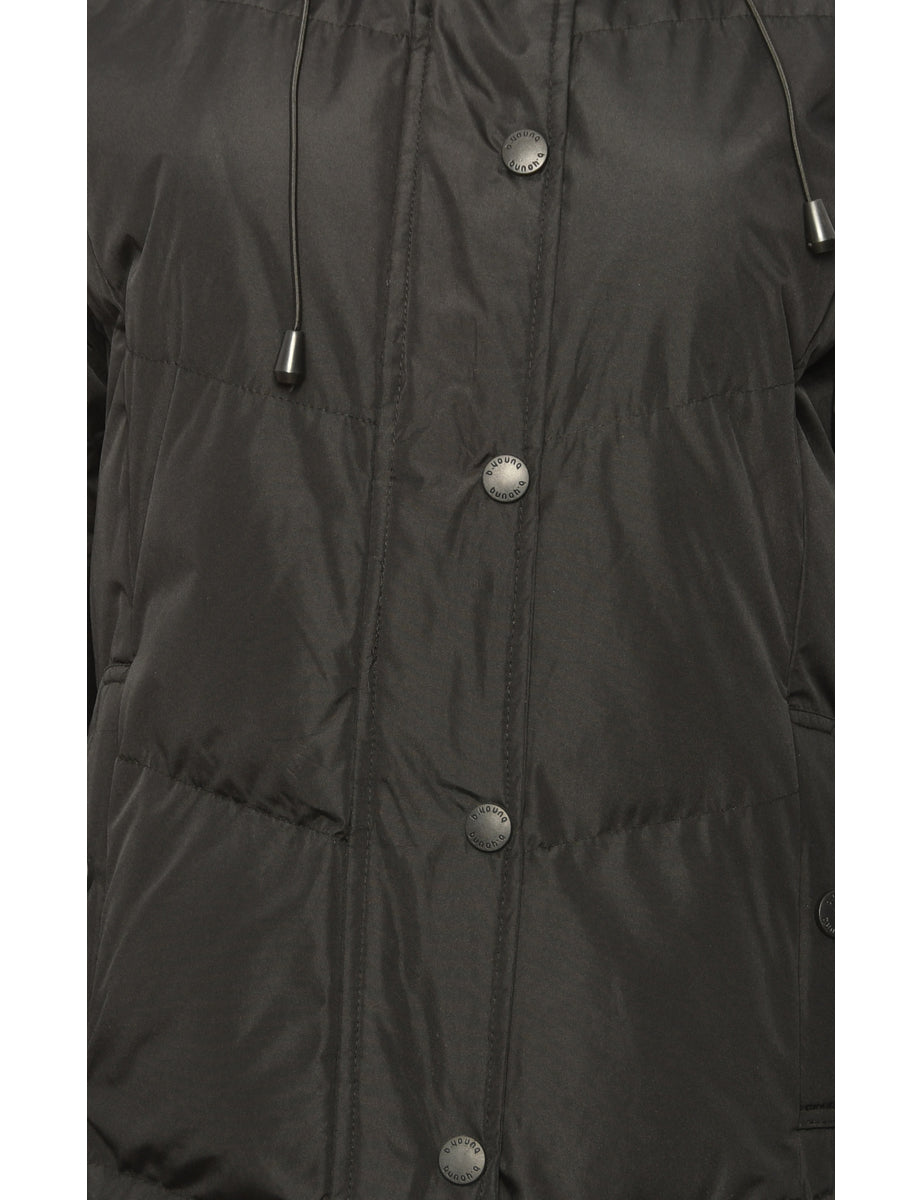 Zip-front black classic puffer jacket complete with multiple pockets.