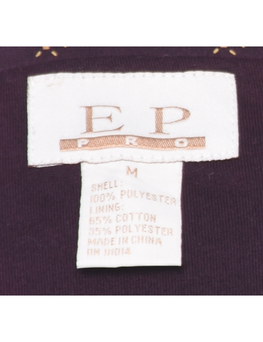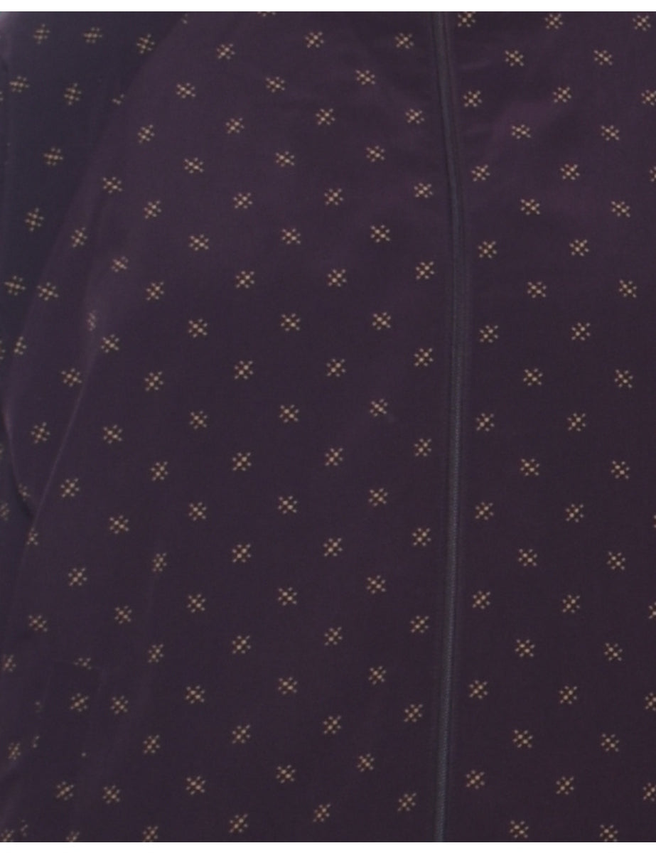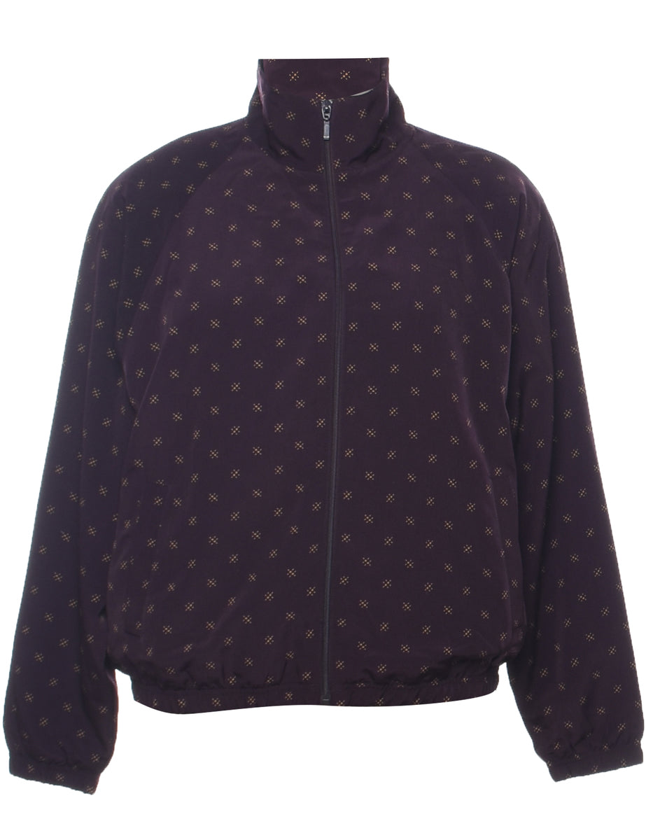 Zip front jacket comes in plum with multiple pockets and raglan sleeves.