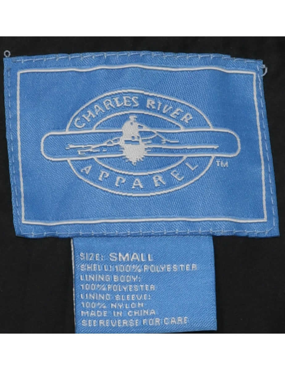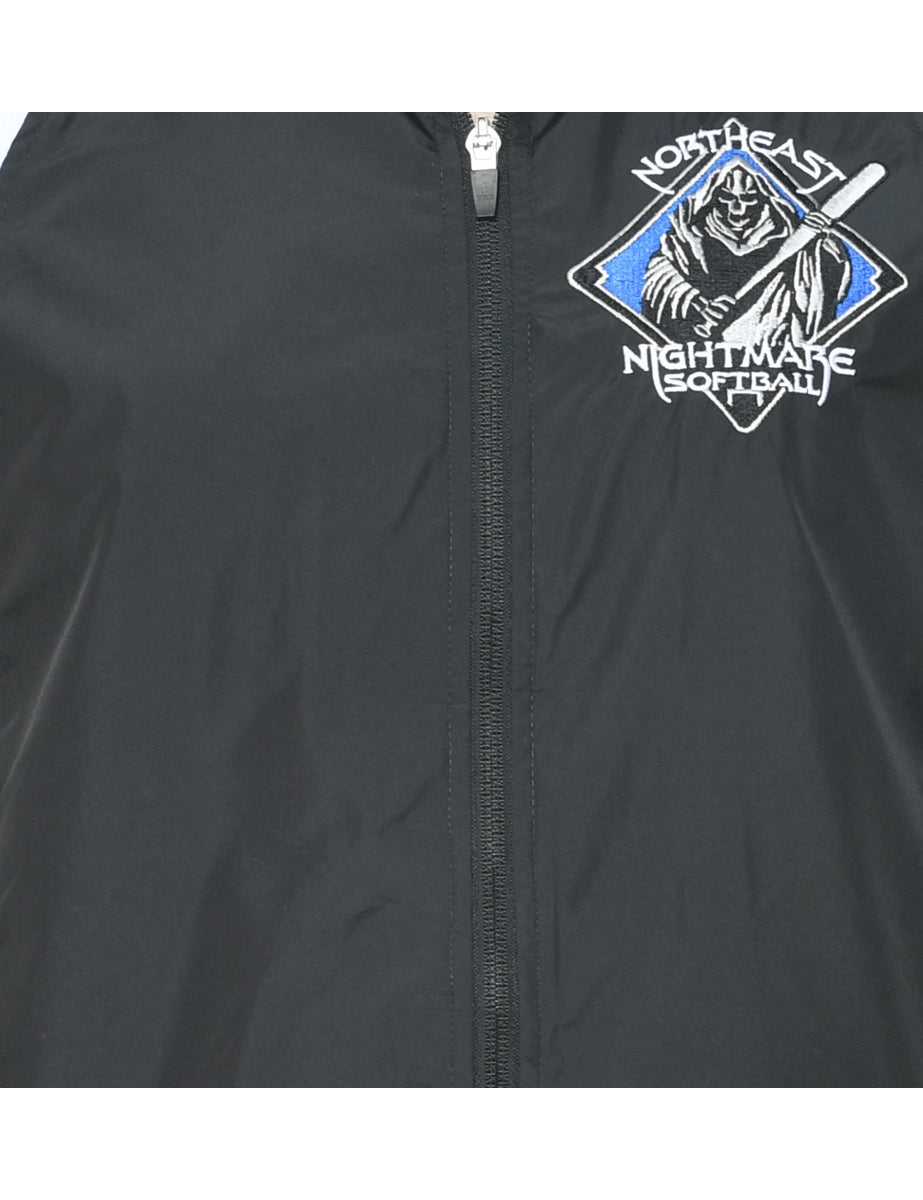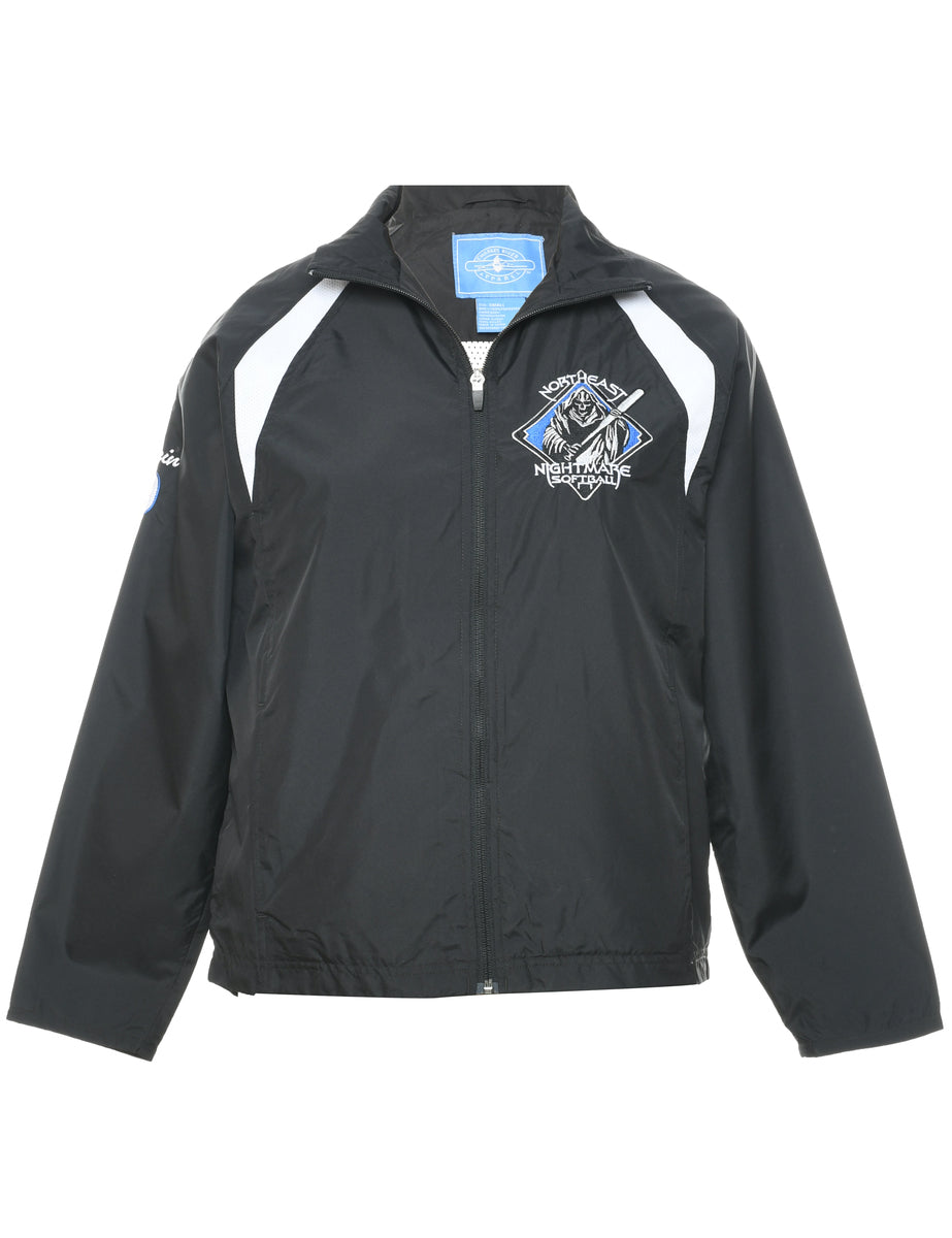 Zip front black jacket with multiple pockets and raglan sleeves.