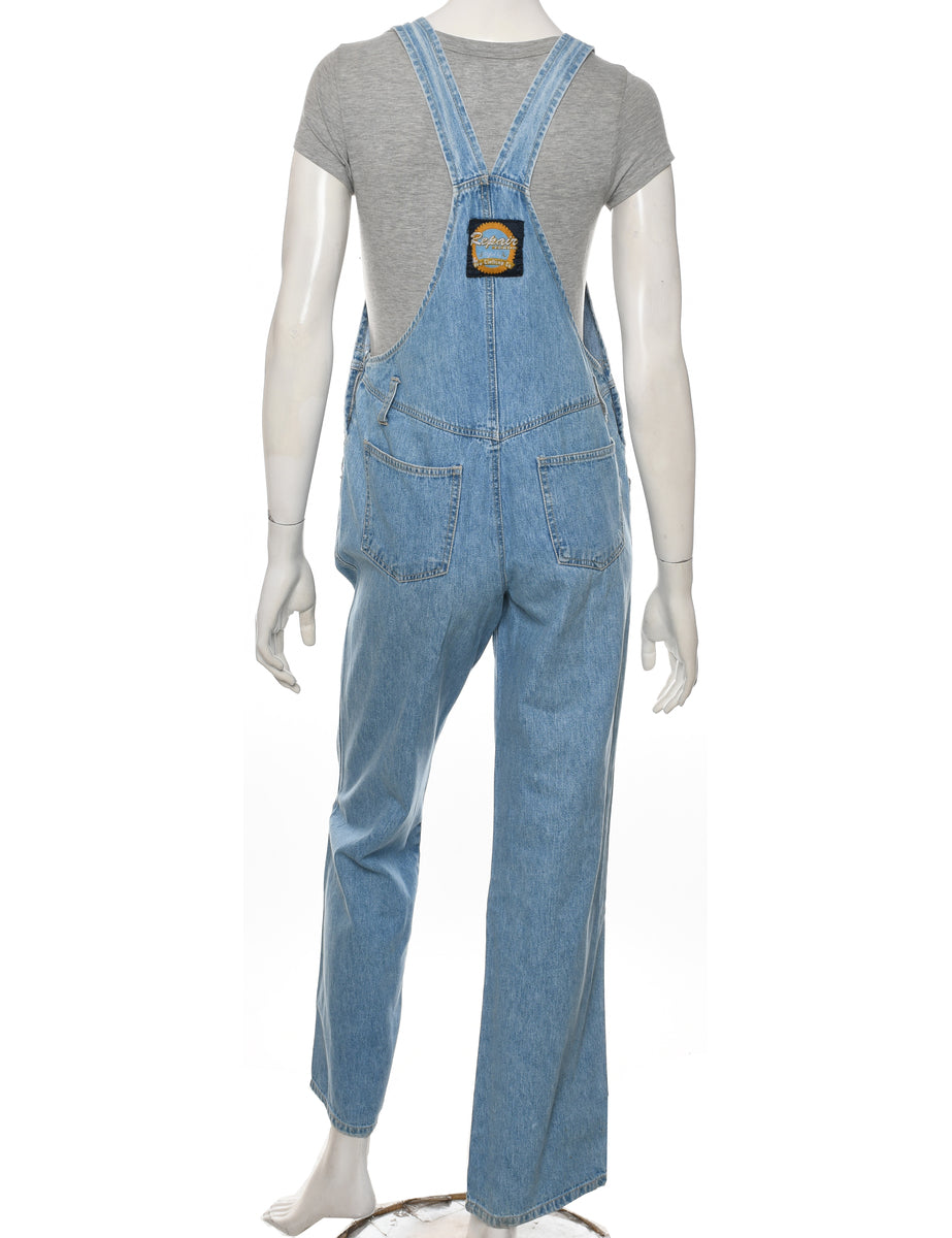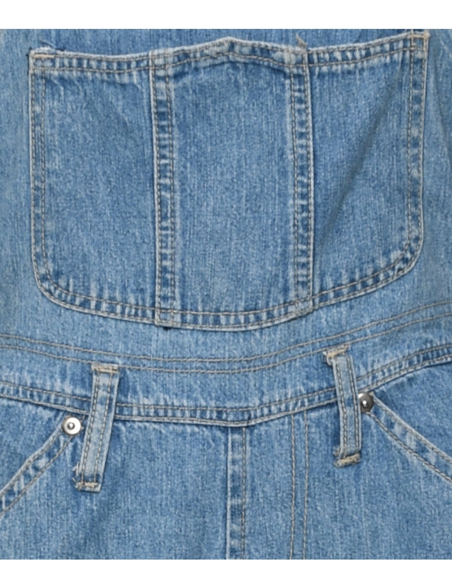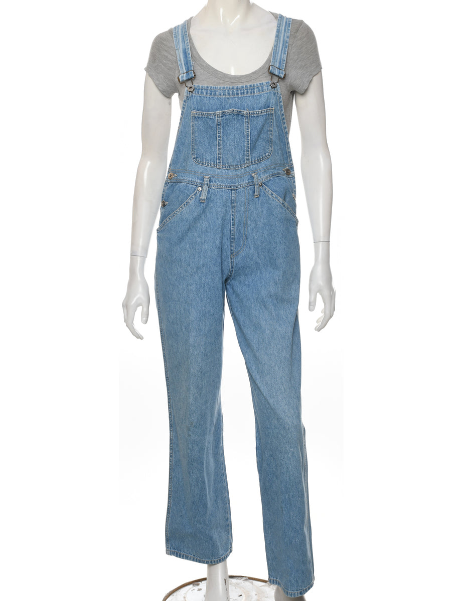 Straight leg dungarees in light wash with adjustable strap and multiple pockets.