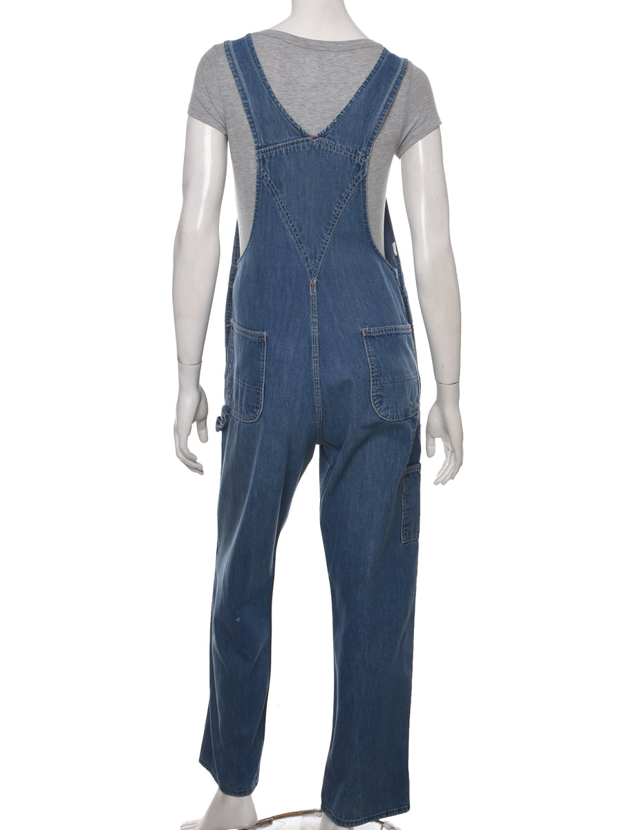 Straight leg medium wash dungarees with adjustable strap and multiple pockets.