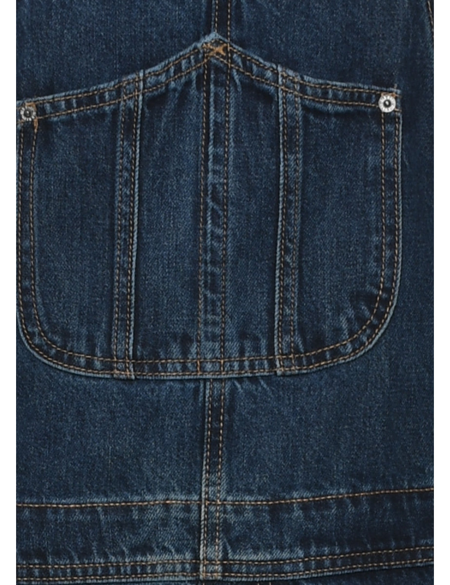 Straight leg stone wash dungarees with adjustable strap and pockets.