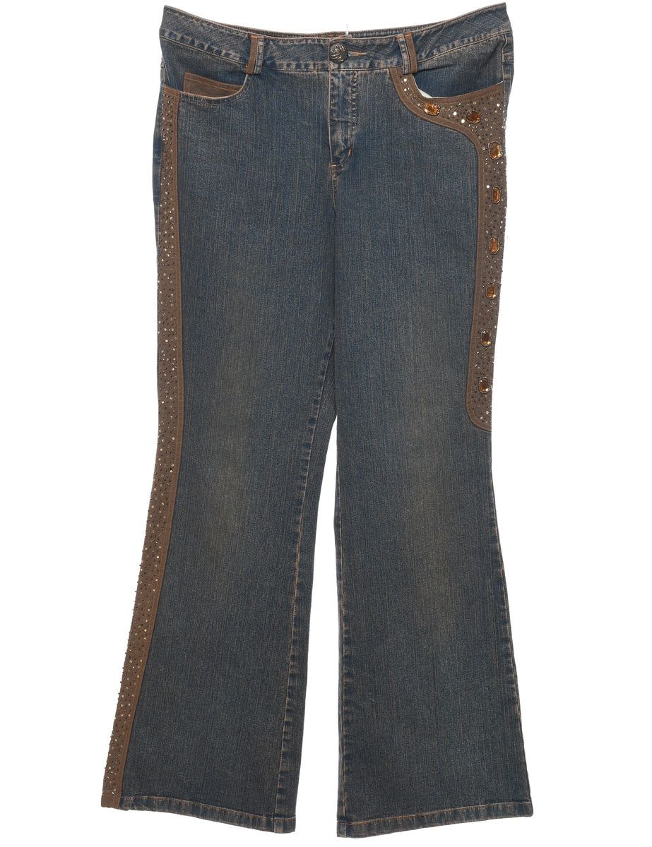Low waist bootcut jeans in stone wash with beading and multiple pockets.