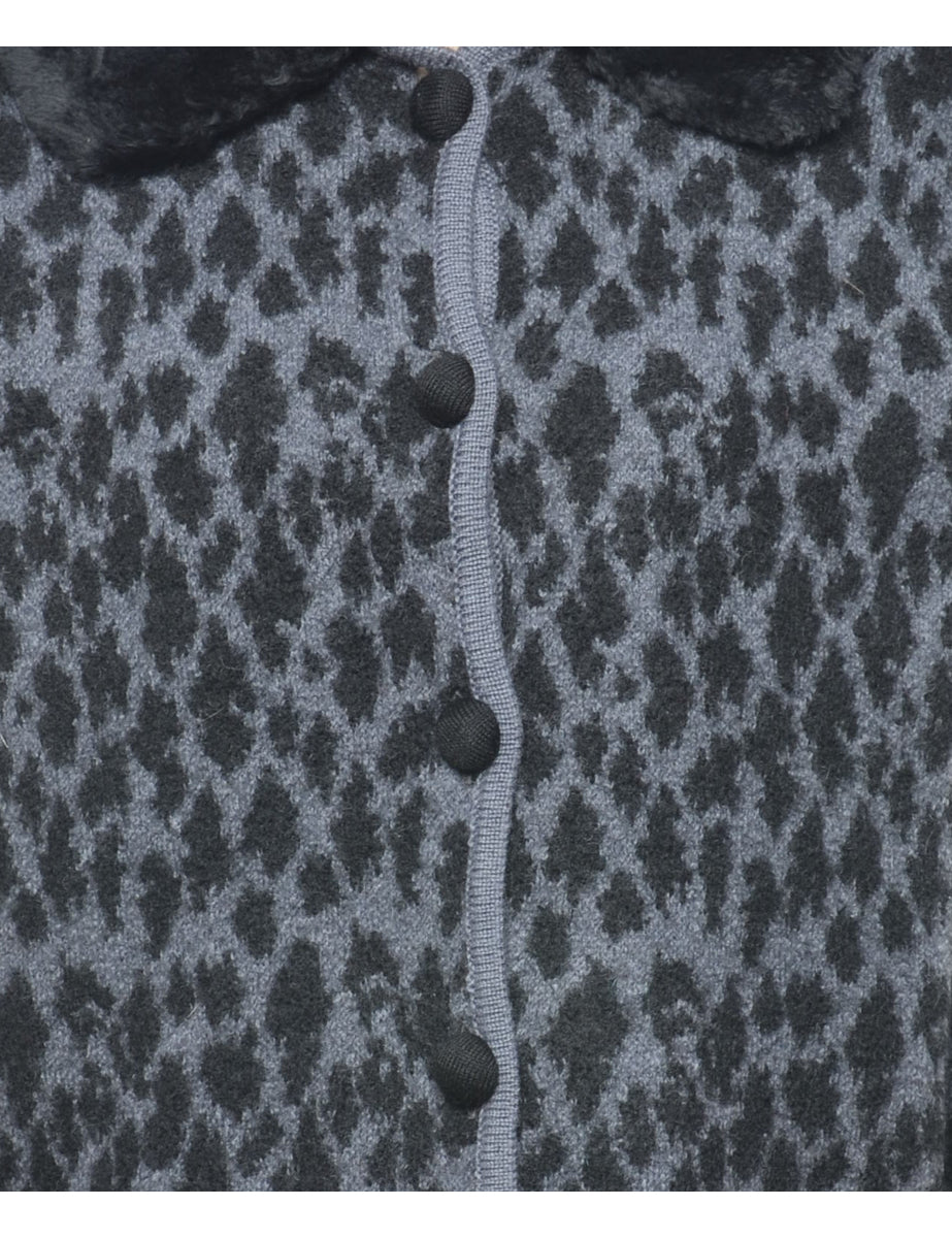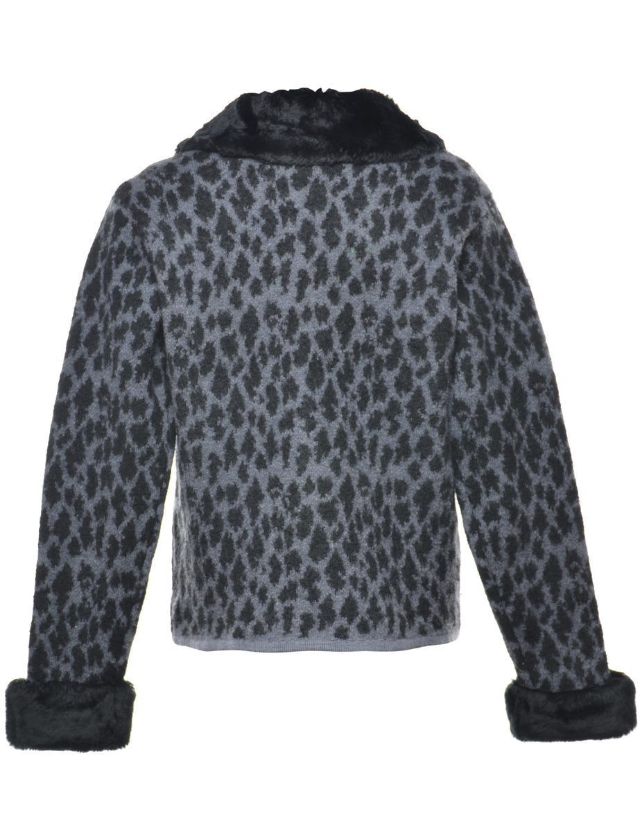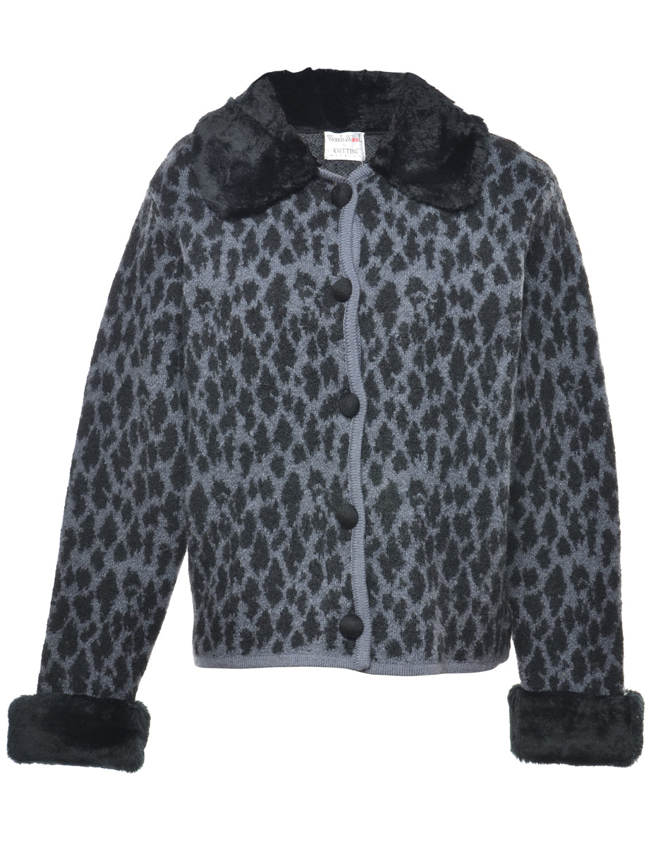 Leopard pattern cardigan comes in grey with faux fur trim.
