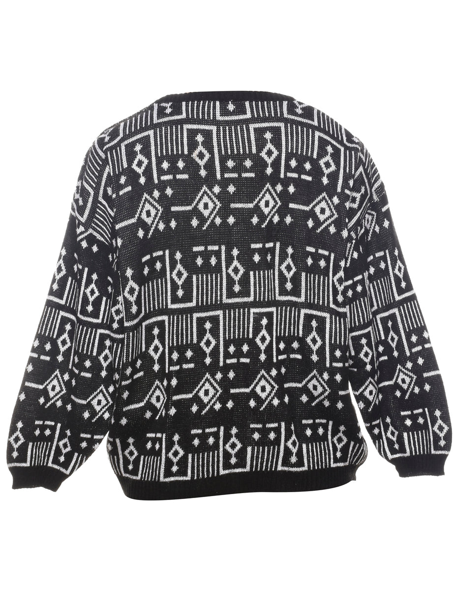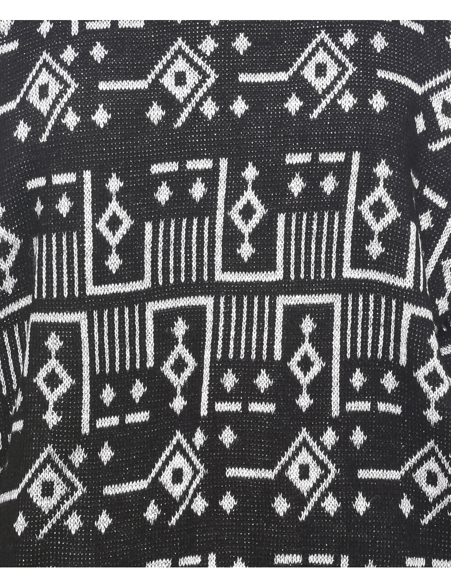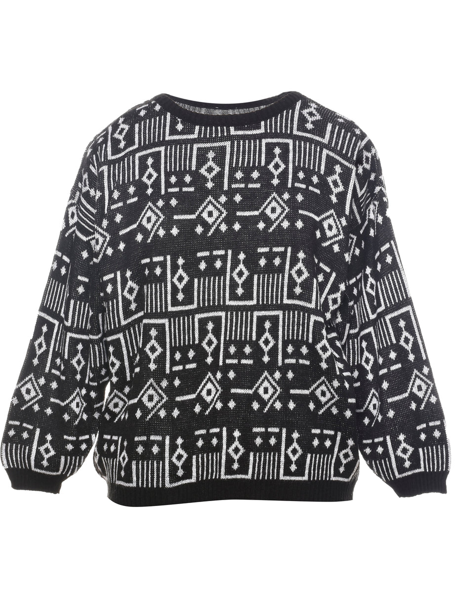 Geometric pattern jumper with lurex thread pattern. Comes in black with a drop shoulder.