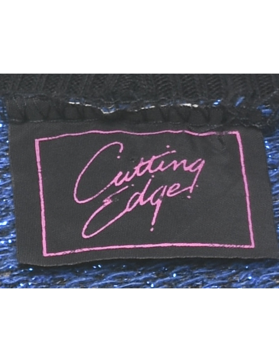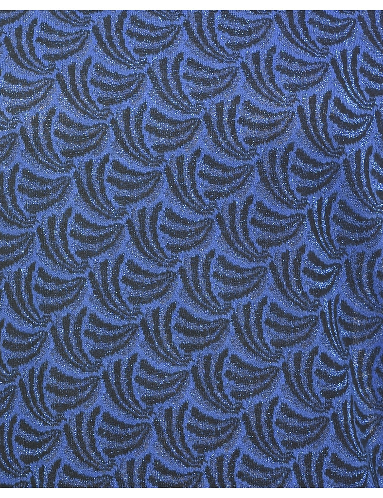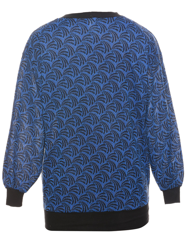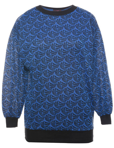 Patterned jumper with lurex thread pattern. Comes in blue with a drop shoulder and contrasting trim.