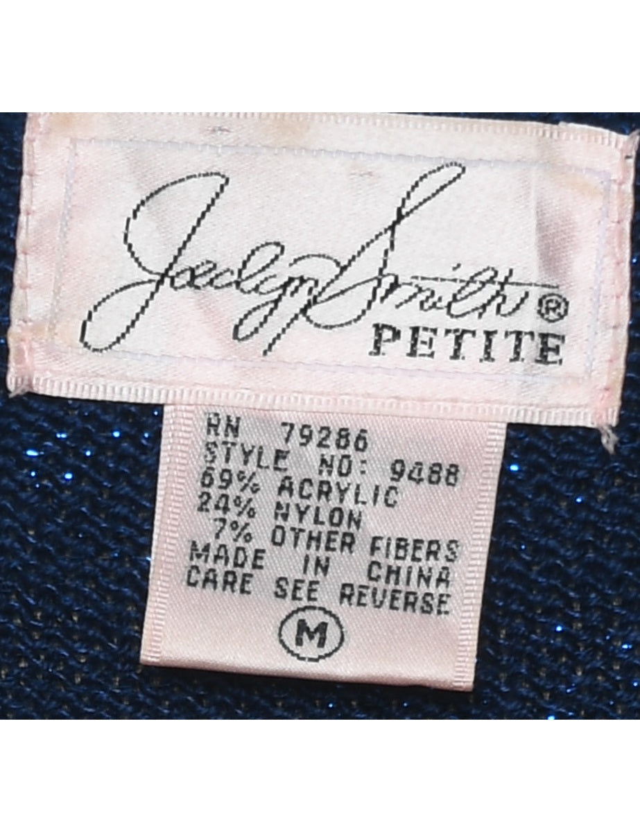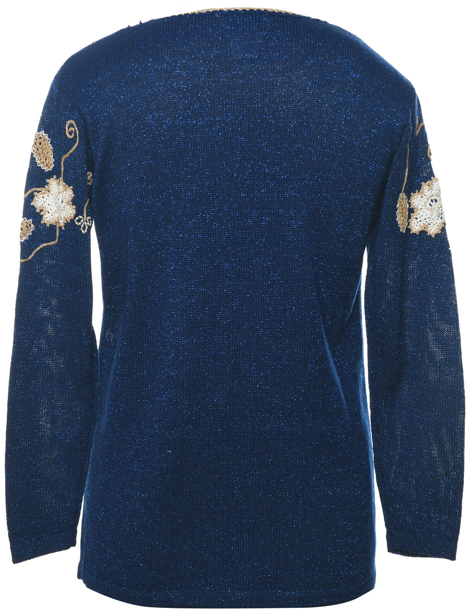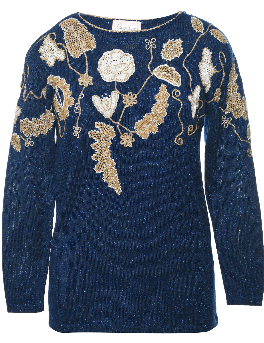 Lurex thread pattern jumper in navy with a round neck and beading.
