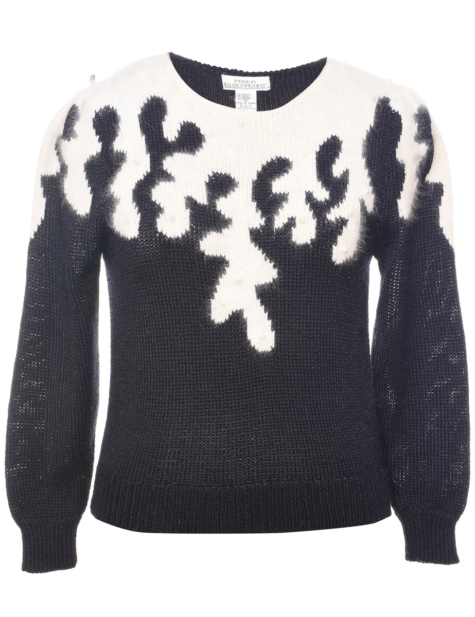 Patterned jumper comes in white & navy with beading and removable shoulder pads.
