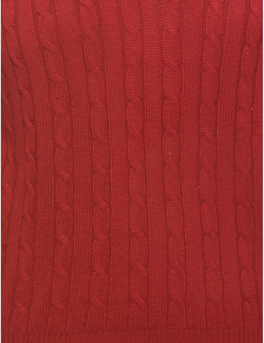 Cable knit red jumper with a v-neck and a drop shoulder.