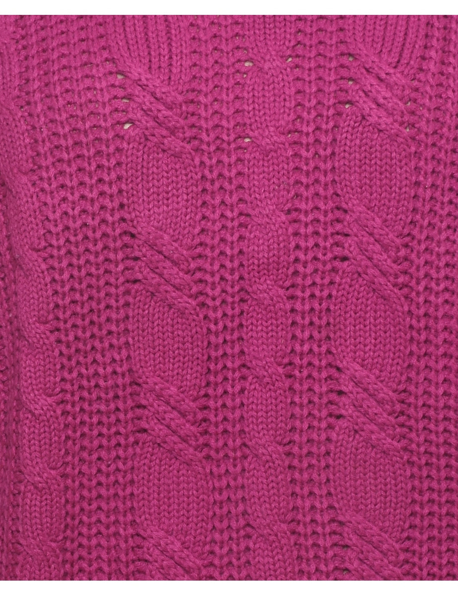 Cable knit jumper in magenta with a crew neck and a drop shoulder.