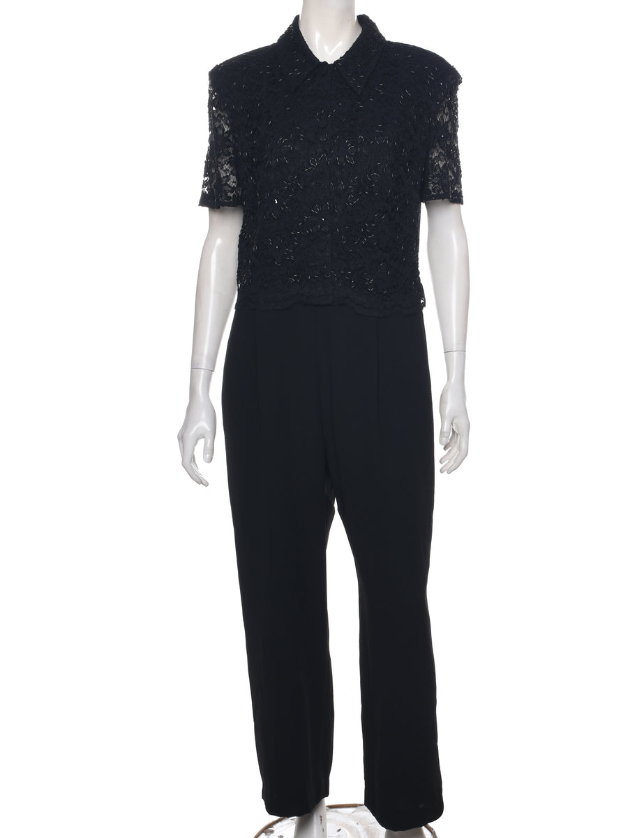 Beaded jumpsuit. Comes in black with built in shoulder pads. Decorative button missing but otherwise in good condition.