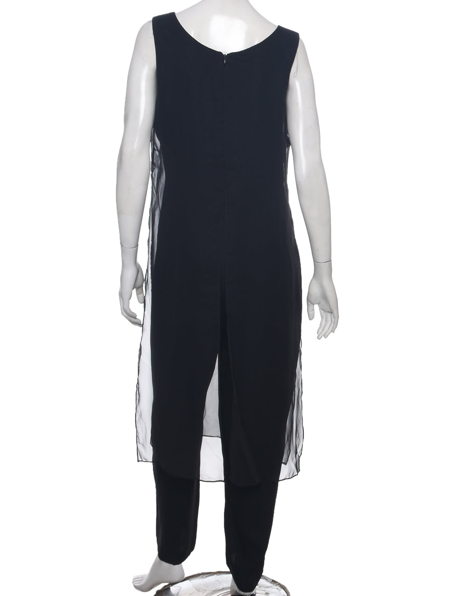 Sleeveless jumpsuit in black with a round neck. Small rip near armpit but otherwise in good condition.