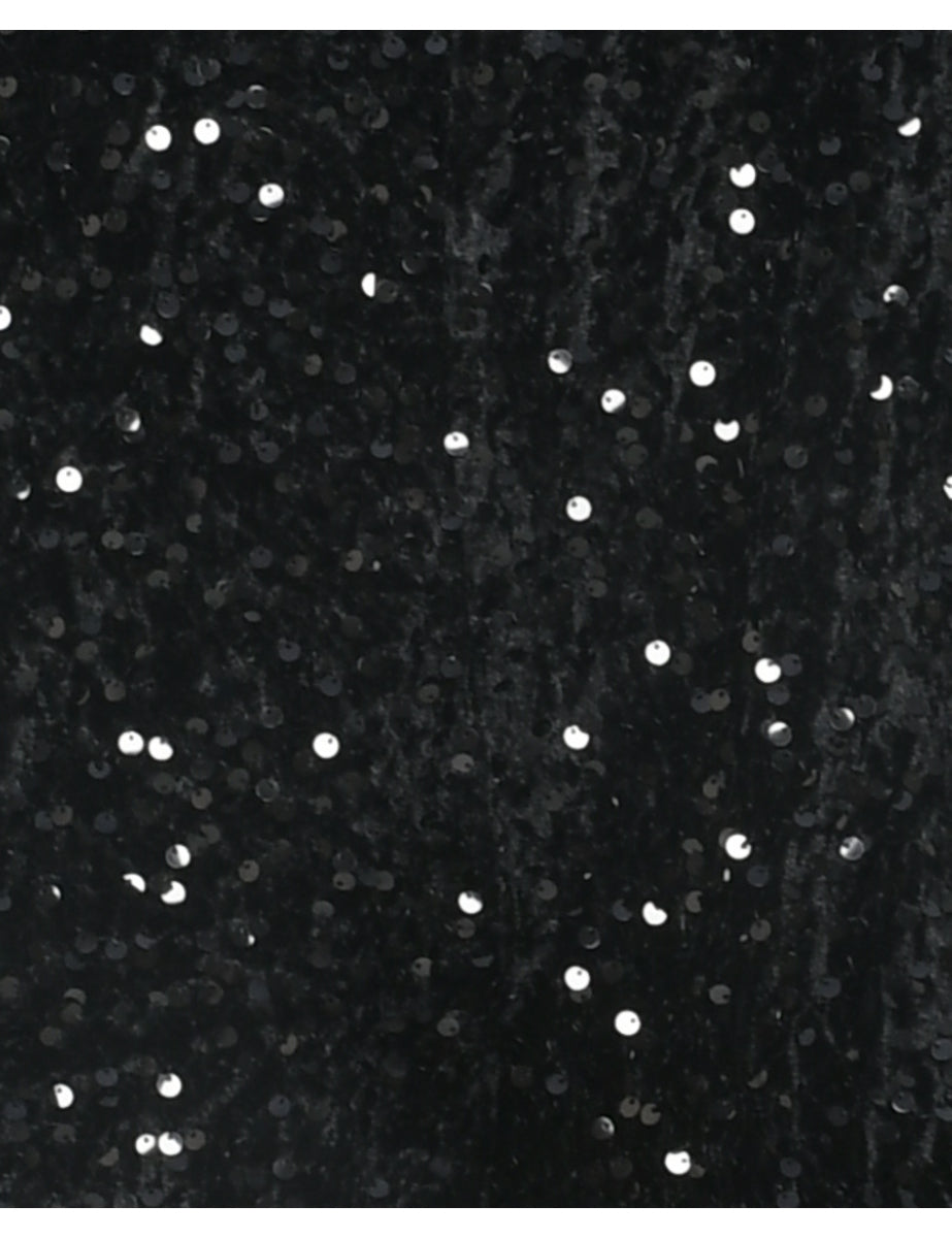 Velvet sequin jumpsuit in black with sheer panels.