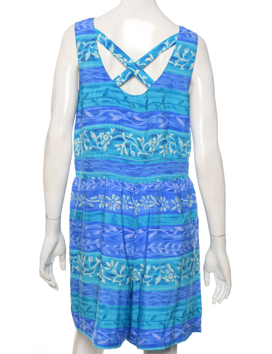 Floral pattern playsuit in turquoise & blue with a criss cross back and pleating.