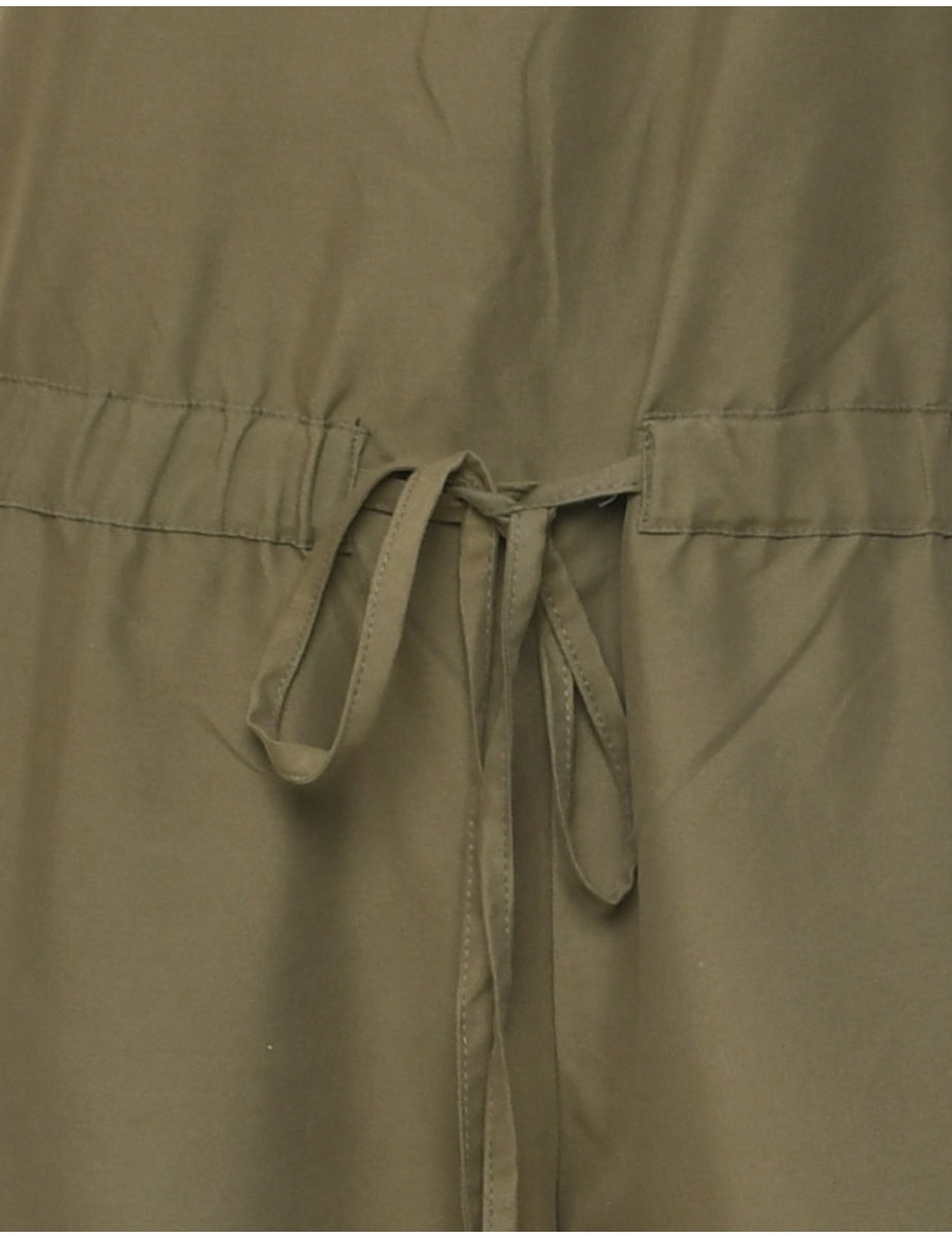 Strapless jumpsuit in olive green with multiple pockets and a drawstring waist.