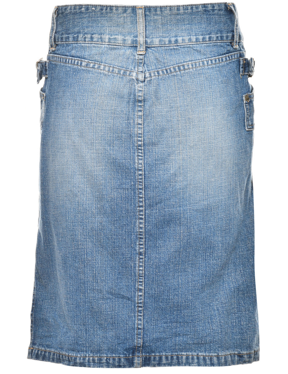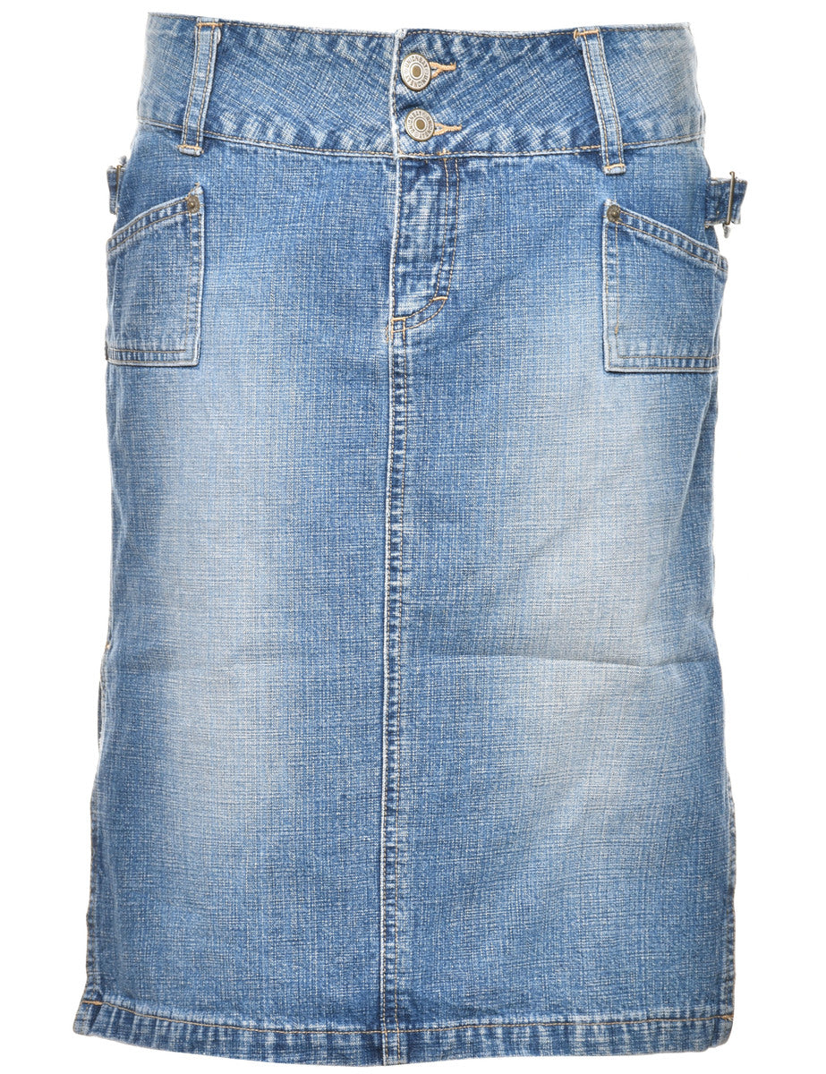 Denim skirt comes in light wash with belt loops and multiple pockets.