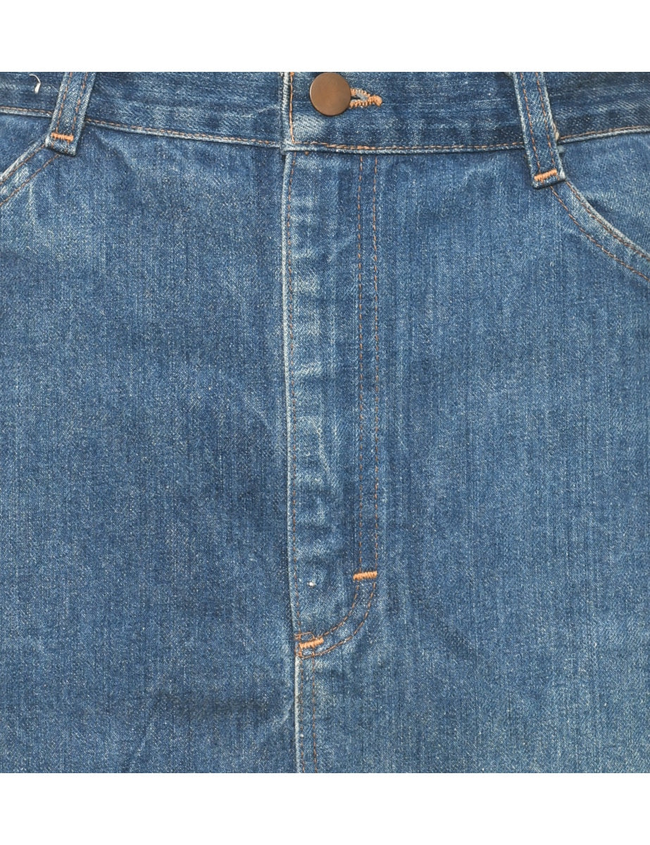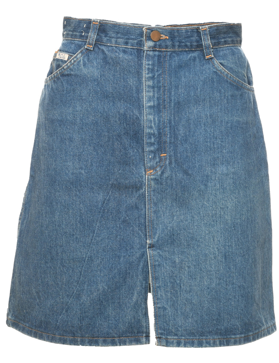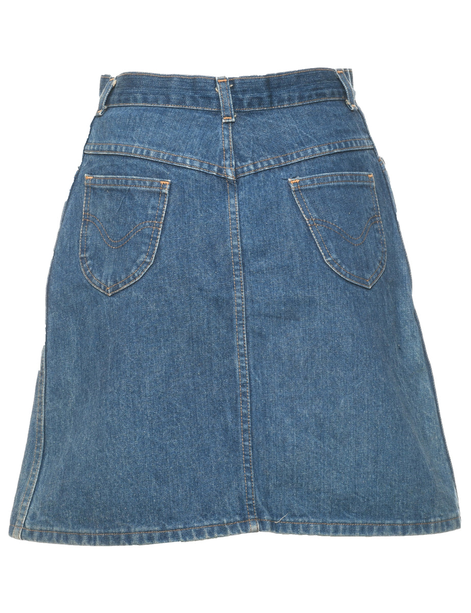 Denim a-line skirt. Comes in medium wash with multiple pockets.
