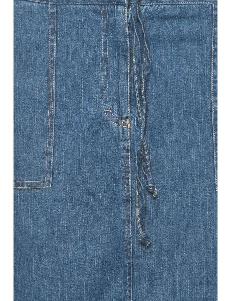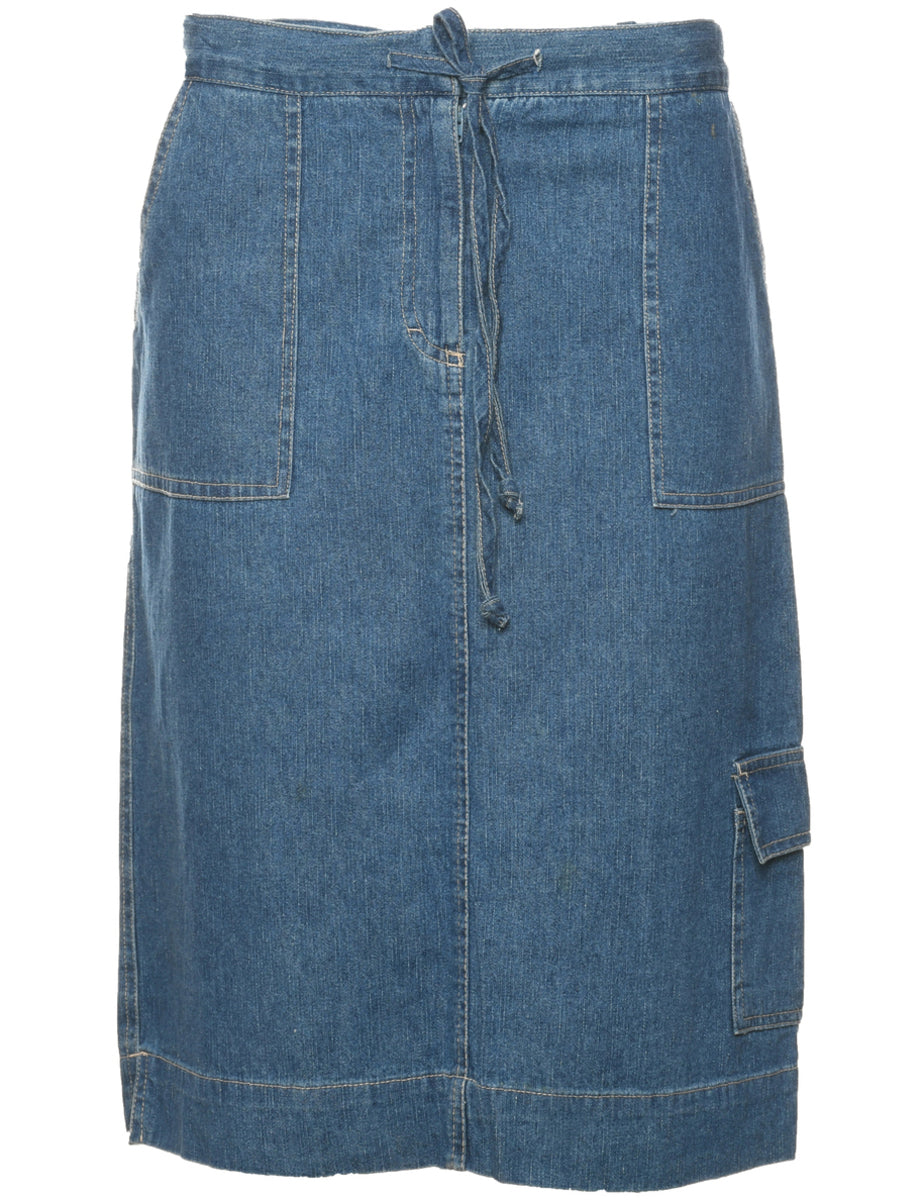 Medium wash denim midi skirt with multiple pockets and a drawstring waist.