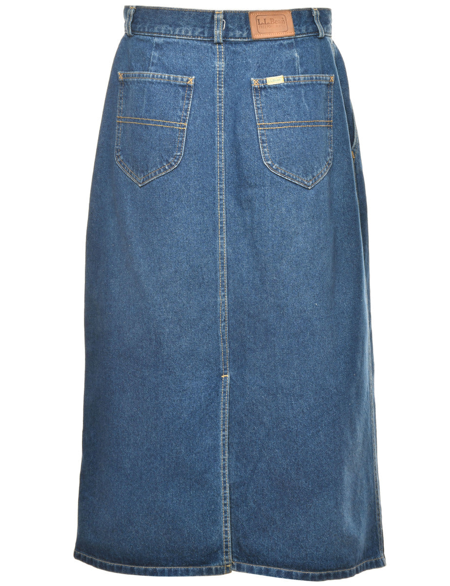 Denim skirt in medium wash with belt loops and multiple pockets.
