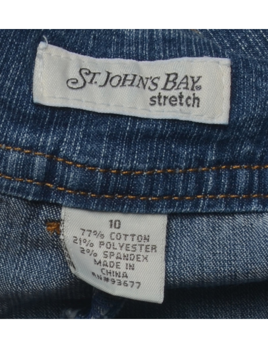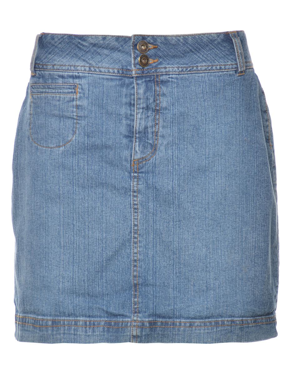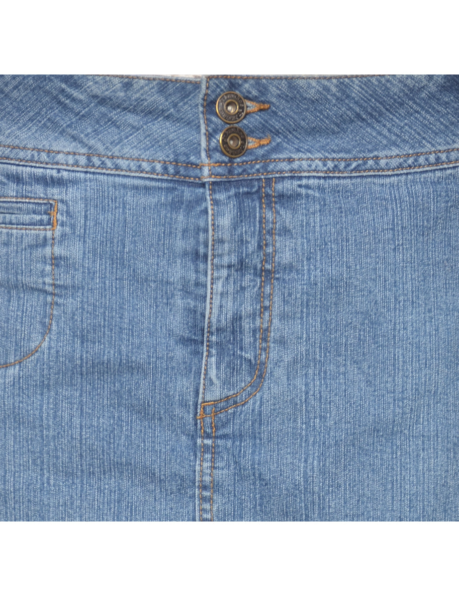 Pencil shape denim skirt. Comes in medium wash with multiple pockets.