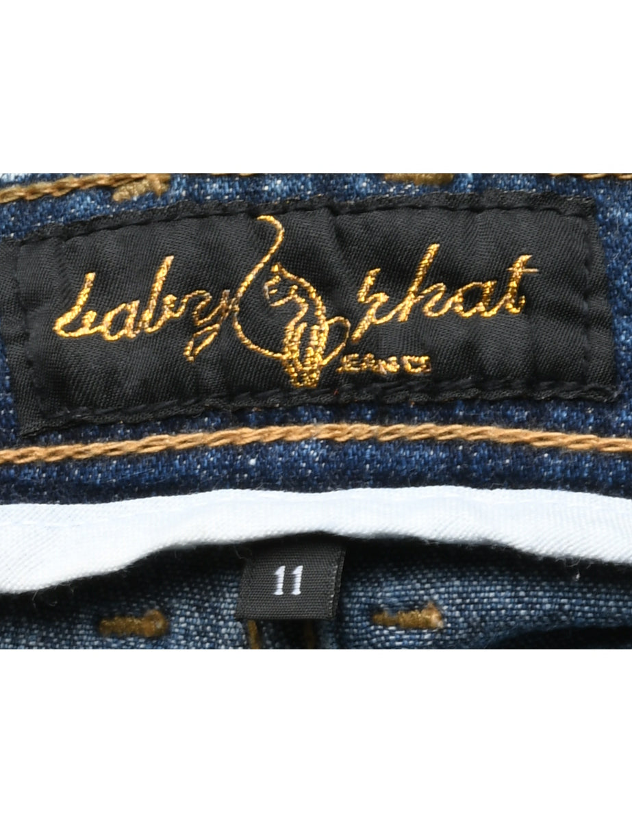 Pencil shape denim skirt in medium wash with multiple pockets.