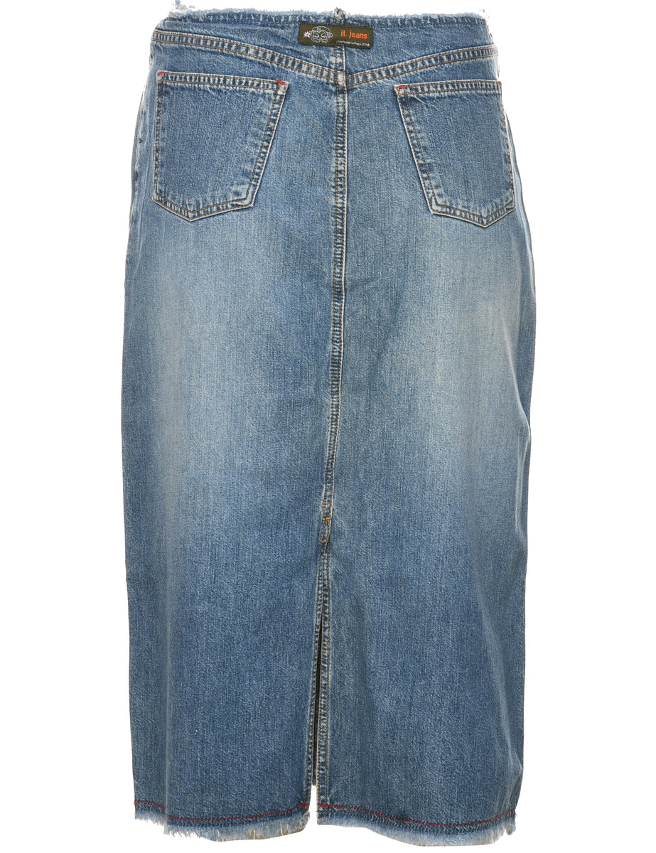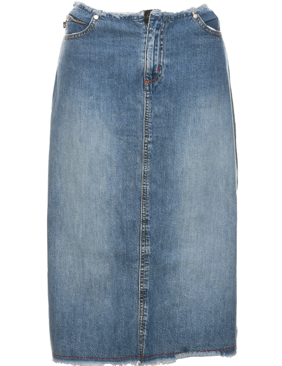 Pencil shape denim skirt comes in medium wash with a frayed hem and slit.
