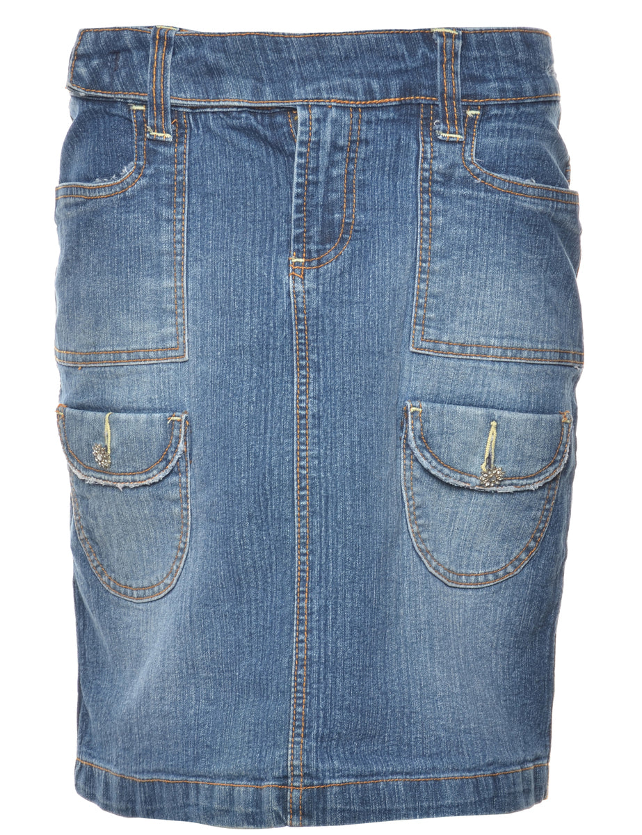 Pencil shape denim skirt. Comes in faded wash with multiple pockets.