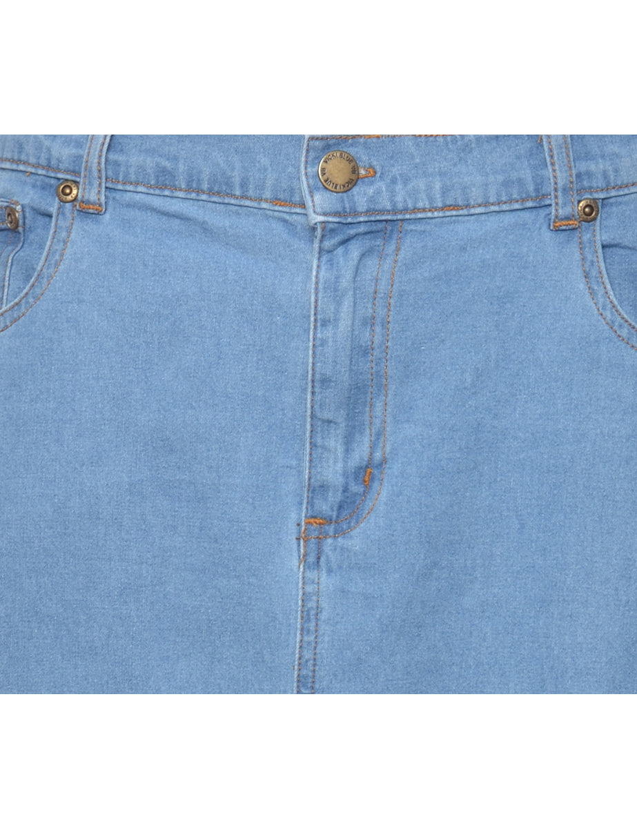 Pencil shape denim skirt. Comes in light wash with multiple pockets.