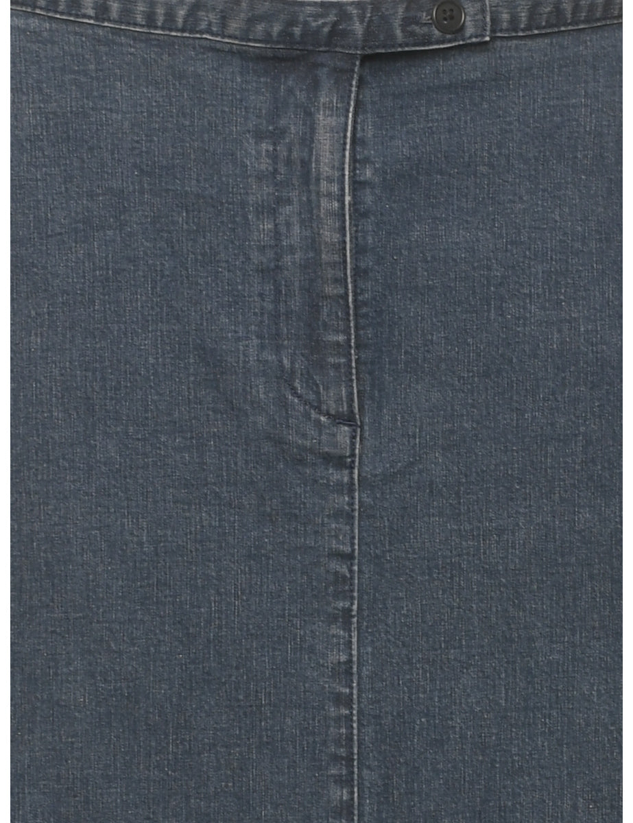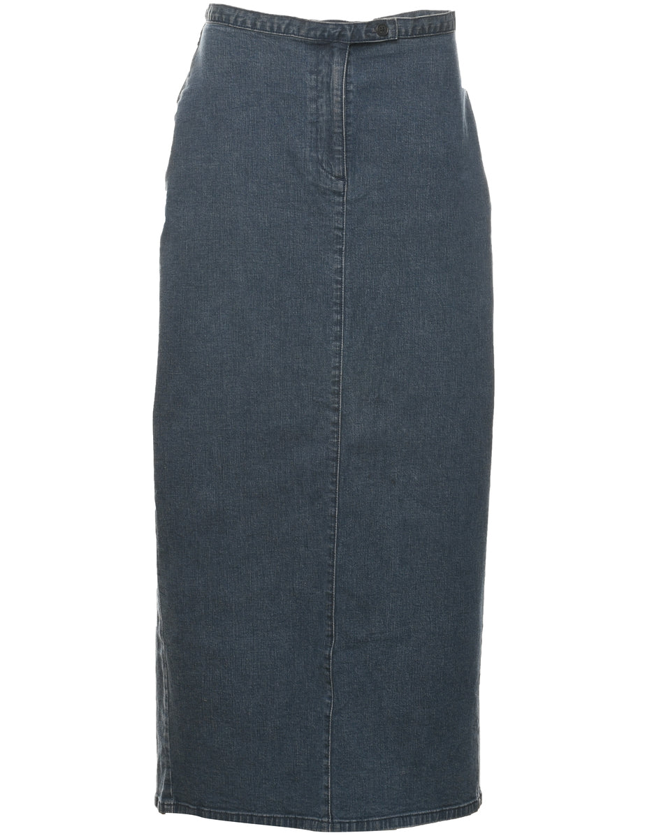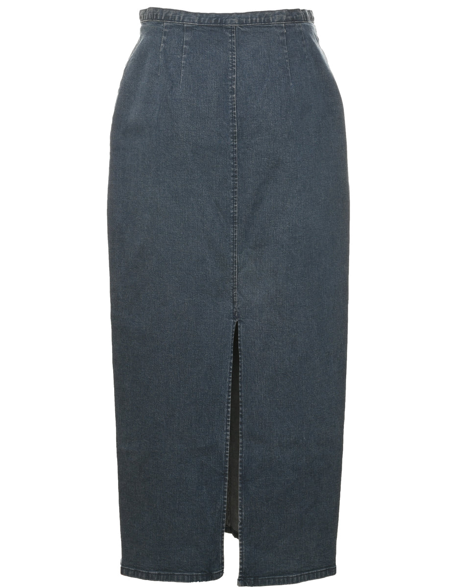Pencil shape denim skirt comes in medium wash with slit and multiple pockets.