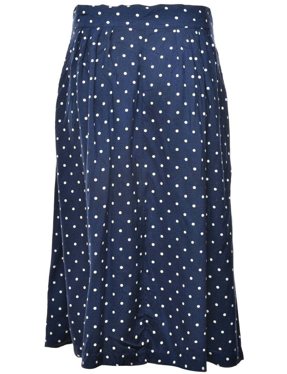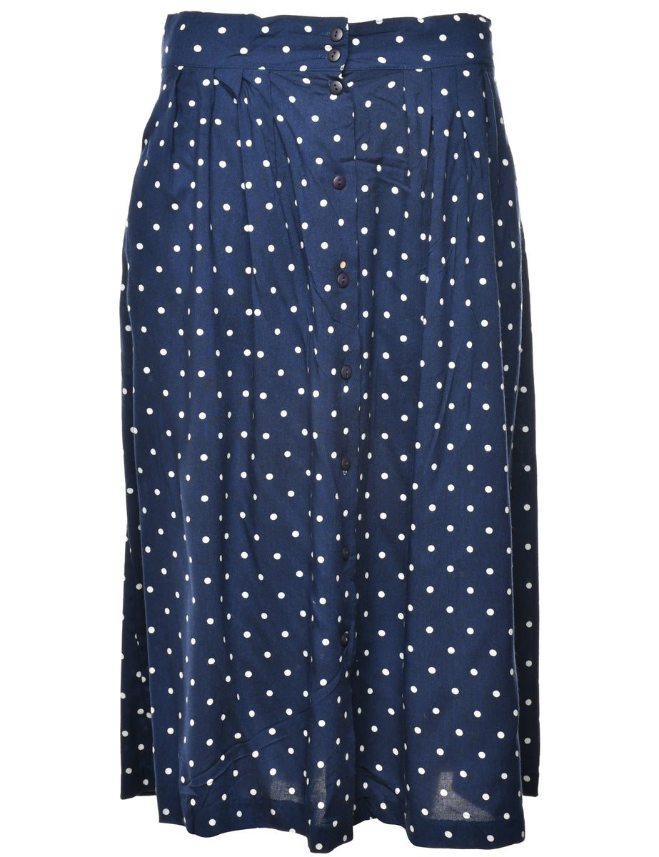 Polka dots maxi skirt comes in navy with front pleats and two pockets.