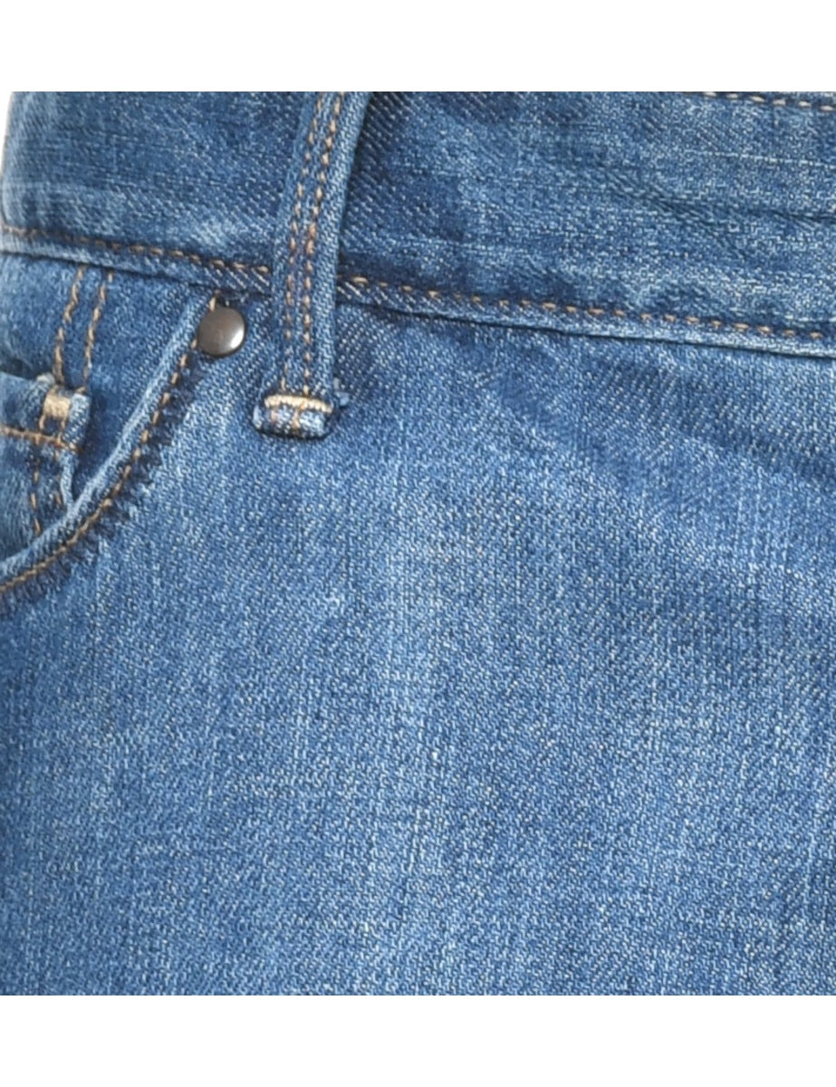 Eddie Bauer denim skirt in medium wash with belt loops and multiple pockets.