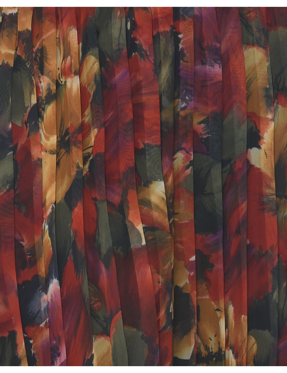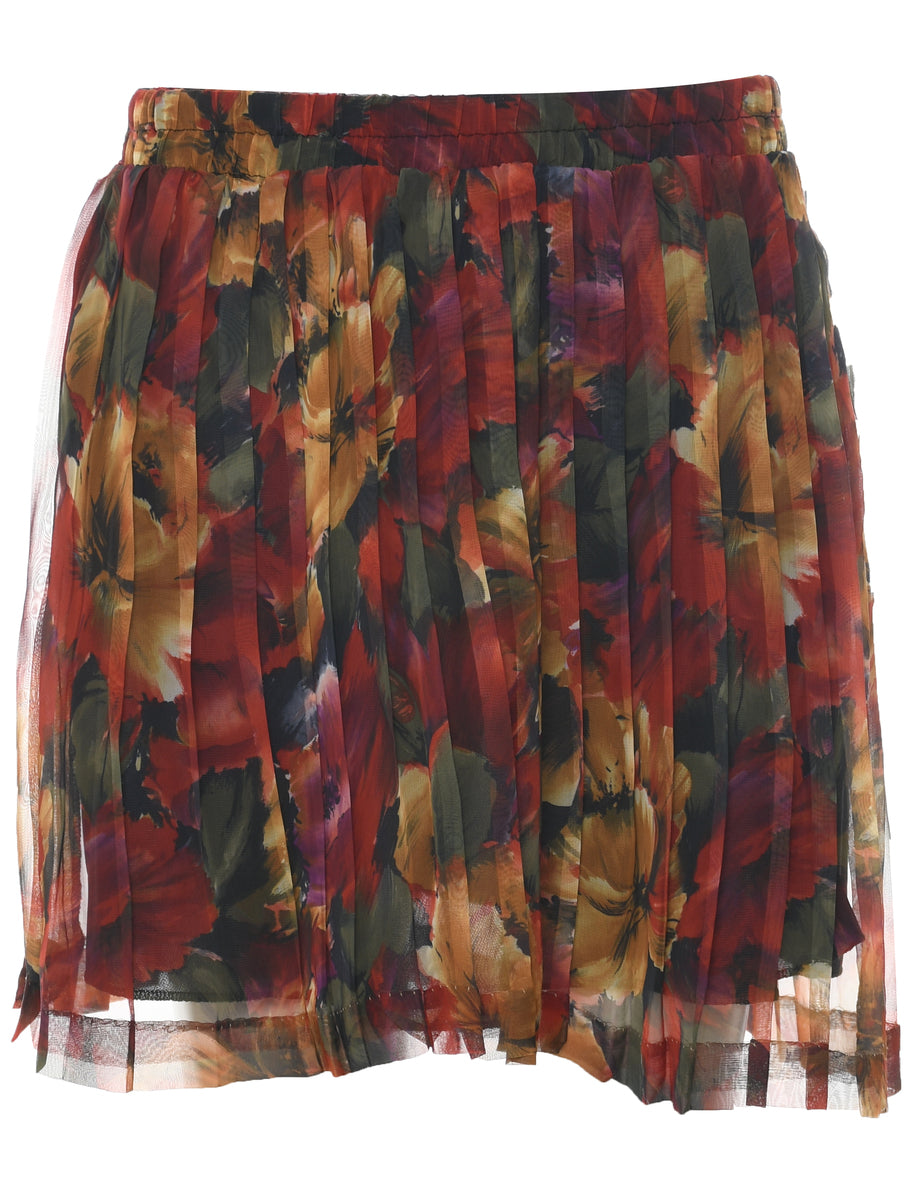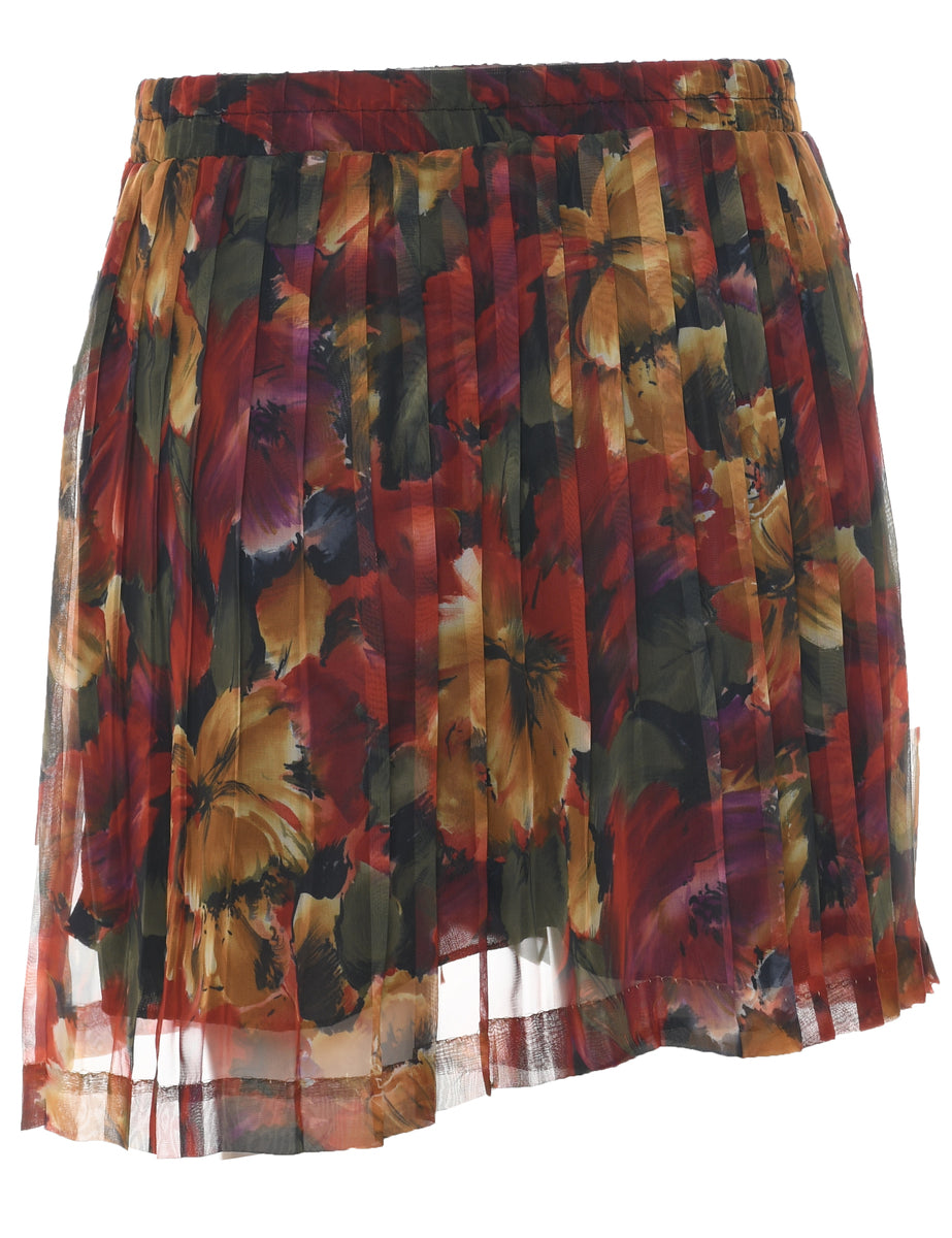Floral pattern pleated skirt comes in multi-colour with an asymmetric hem and an elasticized waist.