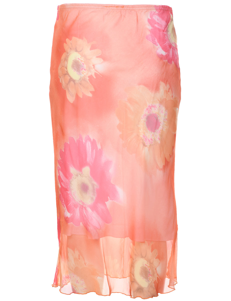 Floral pattern pencil skirt comes in peach with an elasticized waist.