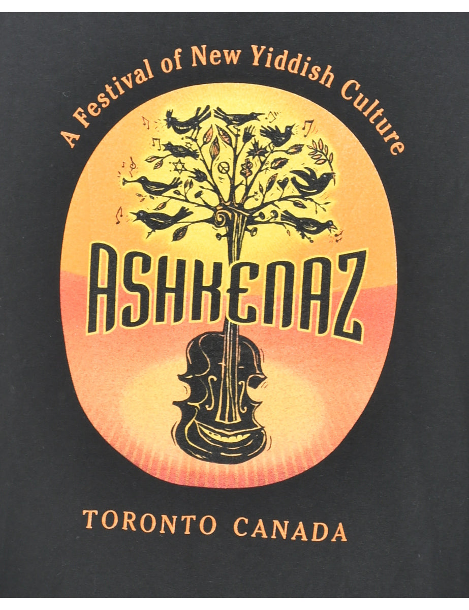 Ashkenaz printed Yiddish festival t-shirt comes in black.