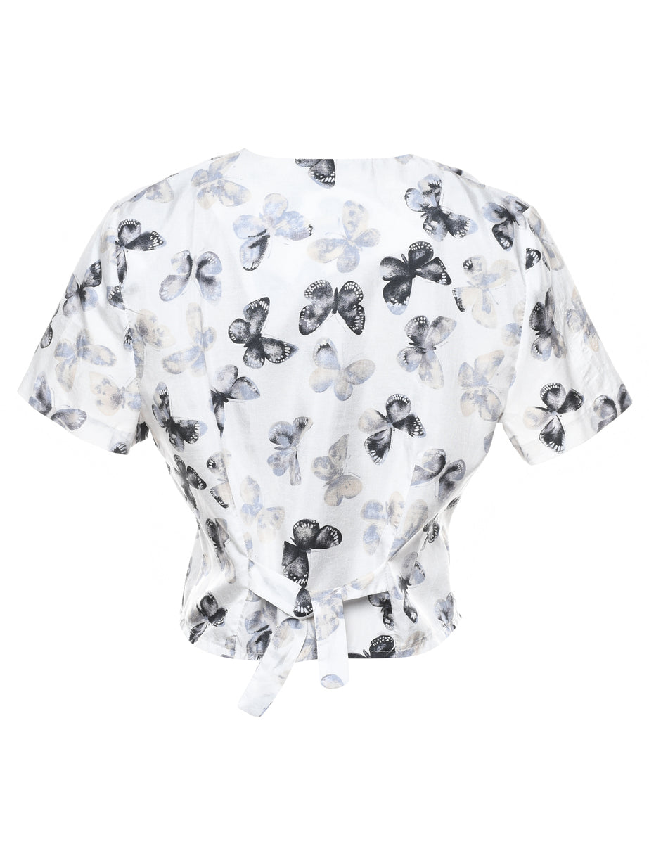 Floral blouse in white with tie detail and removable shoulder pads.